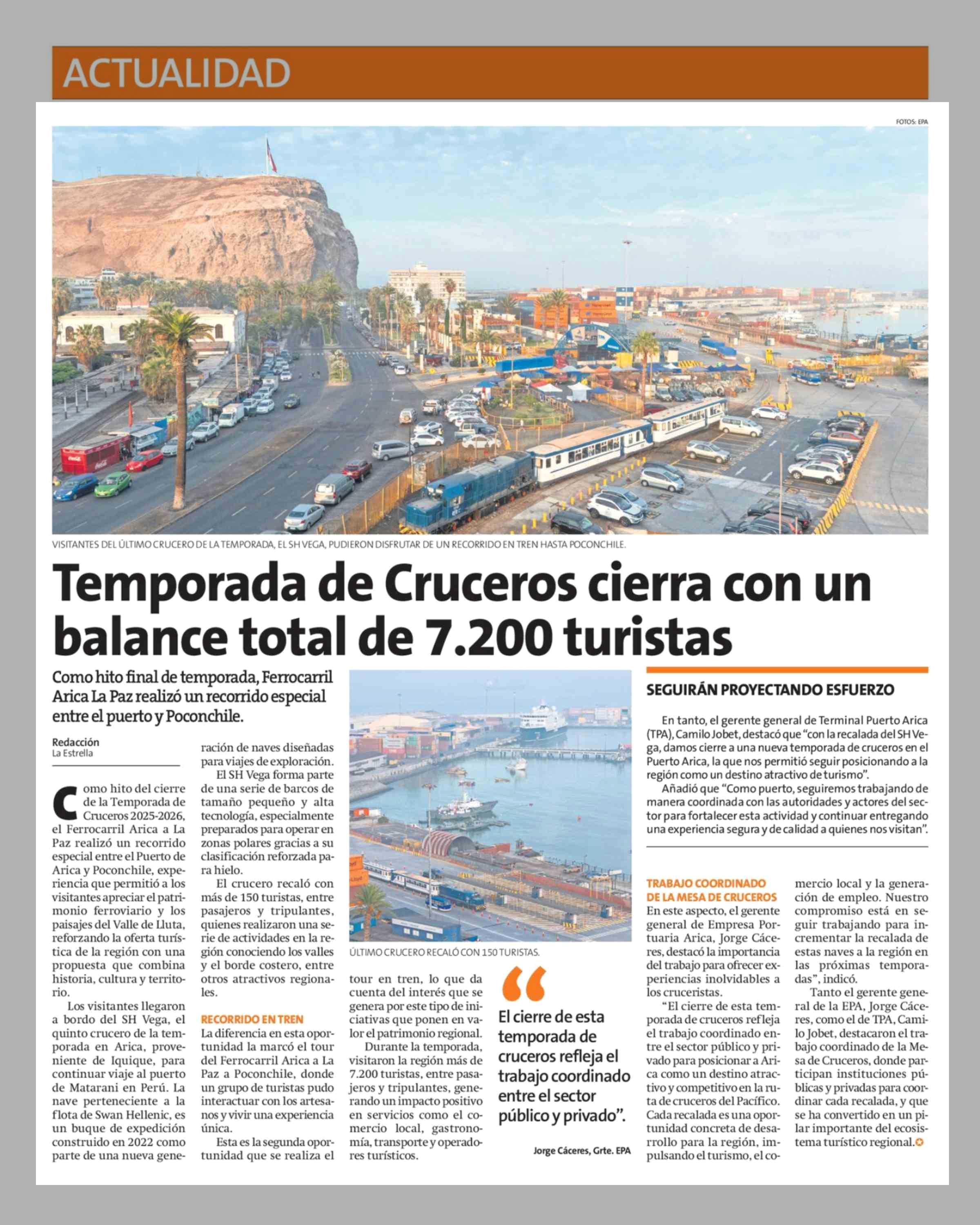 Temporada de Cruceros cierra con un balance total de 7.200 turistas 06-04-2026 La Estrella de Arica |