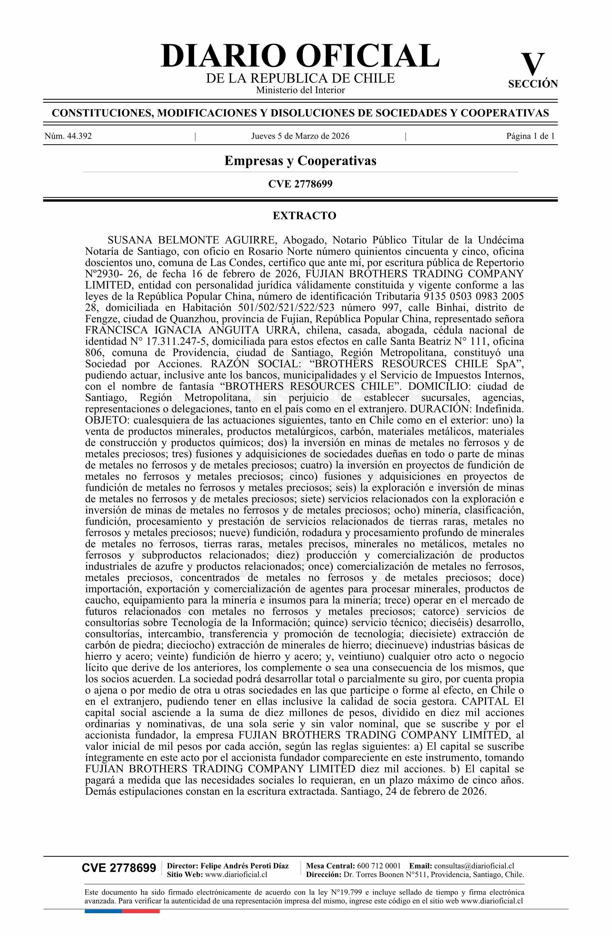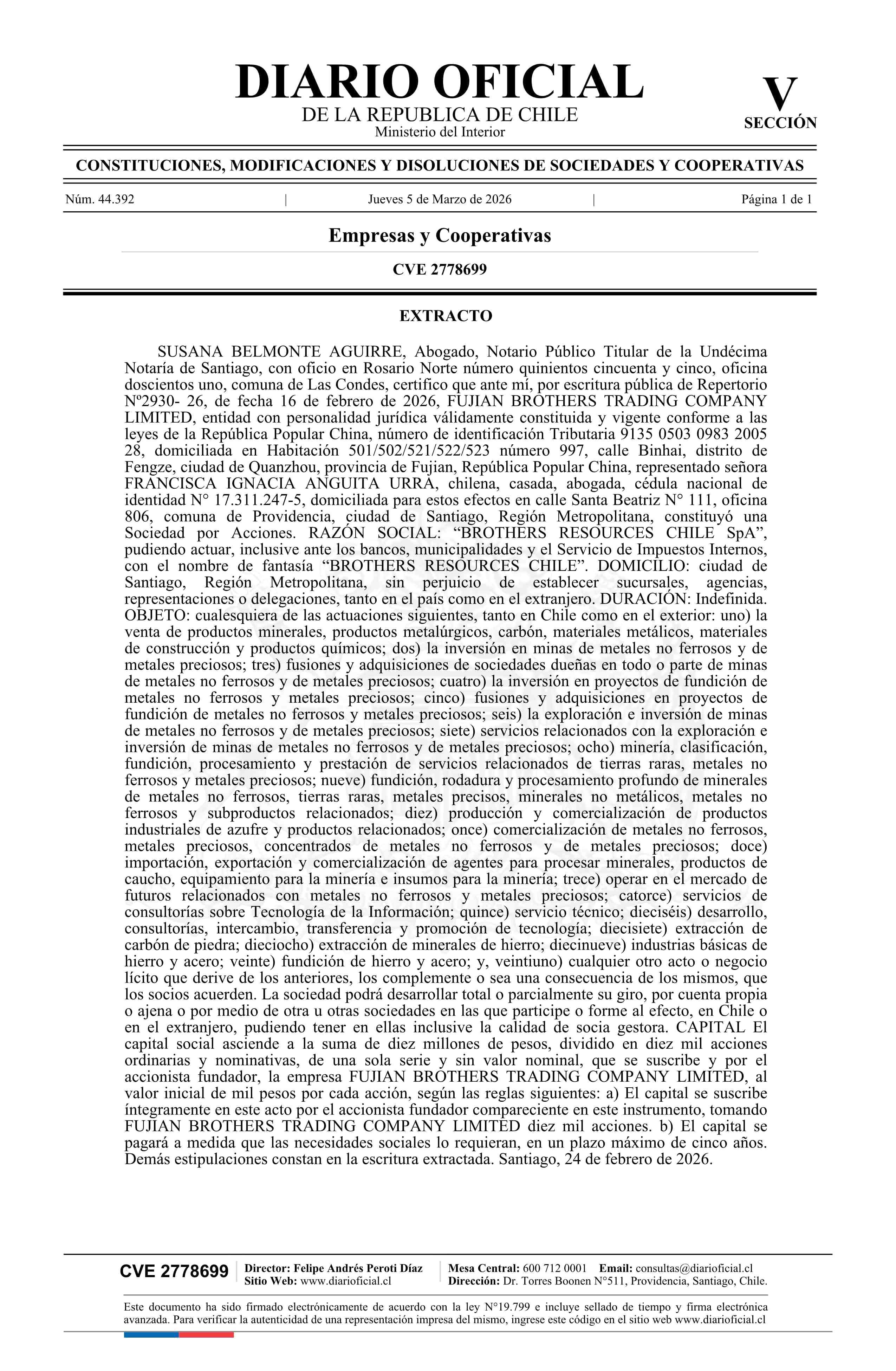 BROTHERS RESOURCES CHILE SpA 05-03-2026 Diario Oficial Edición Electrónica |
