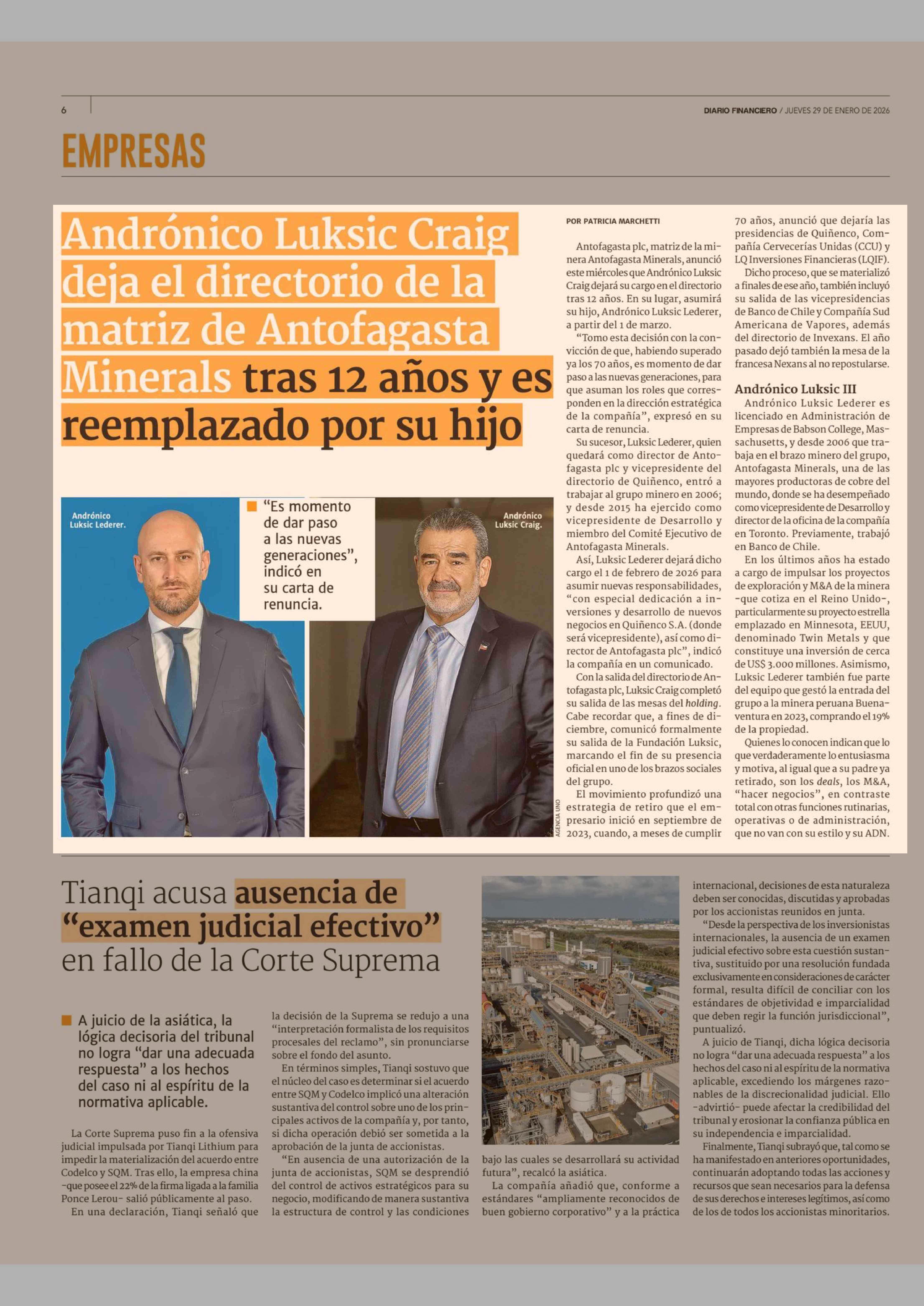Andrónico Luksic Craig deja el directorio de la matriz de Antofagasta Minerals tras 12 años y es reemplazado por su hijo 29-01-2026 Diario Financiero |