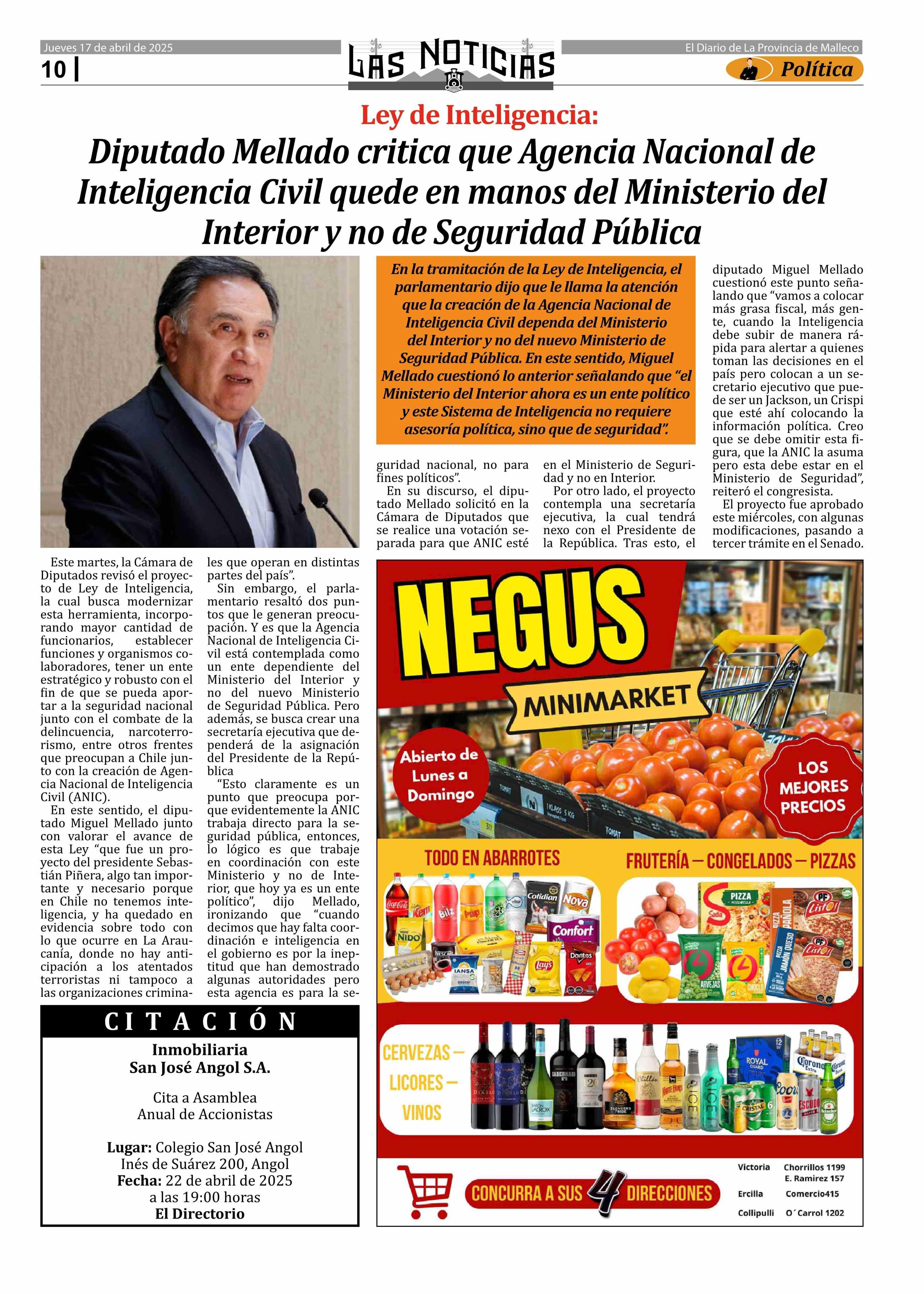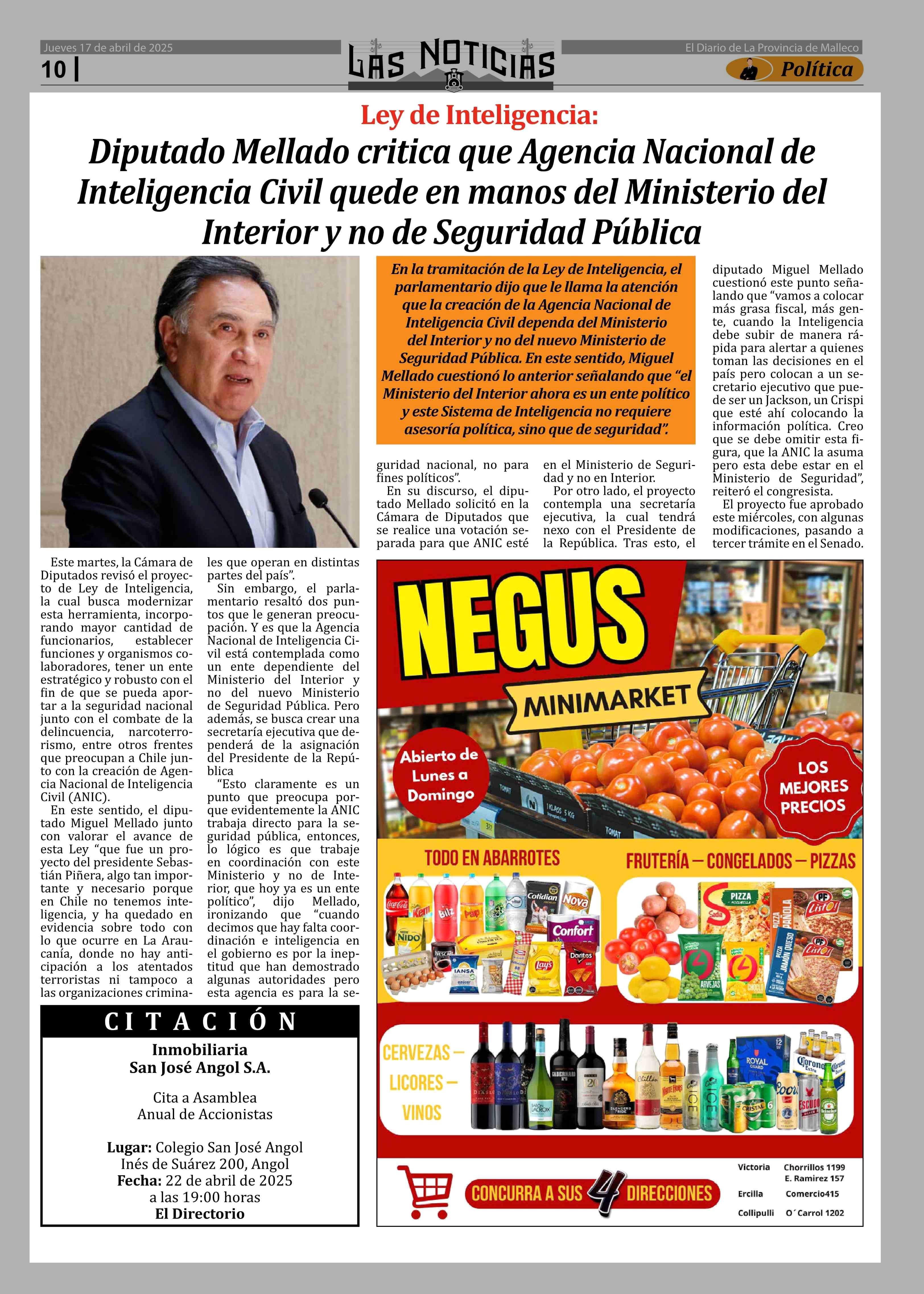 Diputado Mellado critica que Agencia Nacional de Inteligencia Civil quede en manos del Ministerio del Interior y no de Seguridad Pública 17-04-2025 Las Noticias |