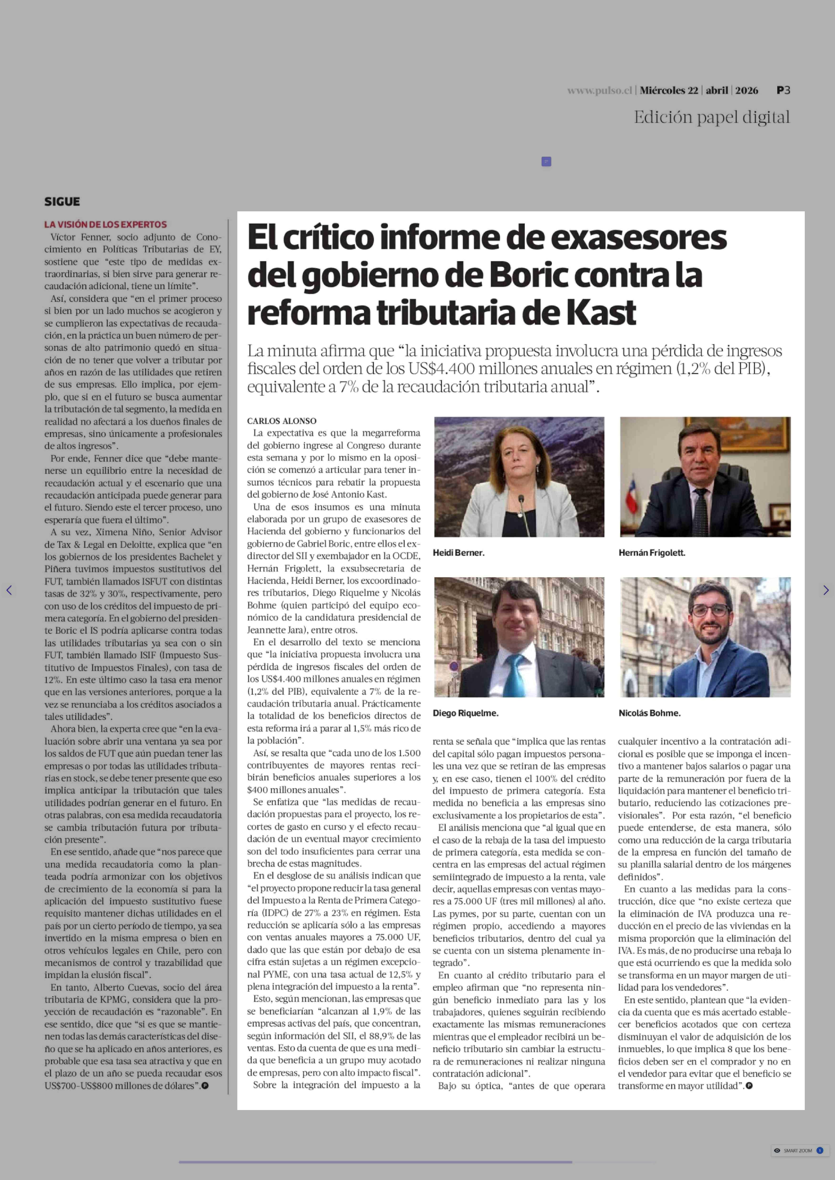 El crítico informe de exasesores del gobierno de Boric contra la reforma tributaria de Kast 22-04-2026 La Tercera |