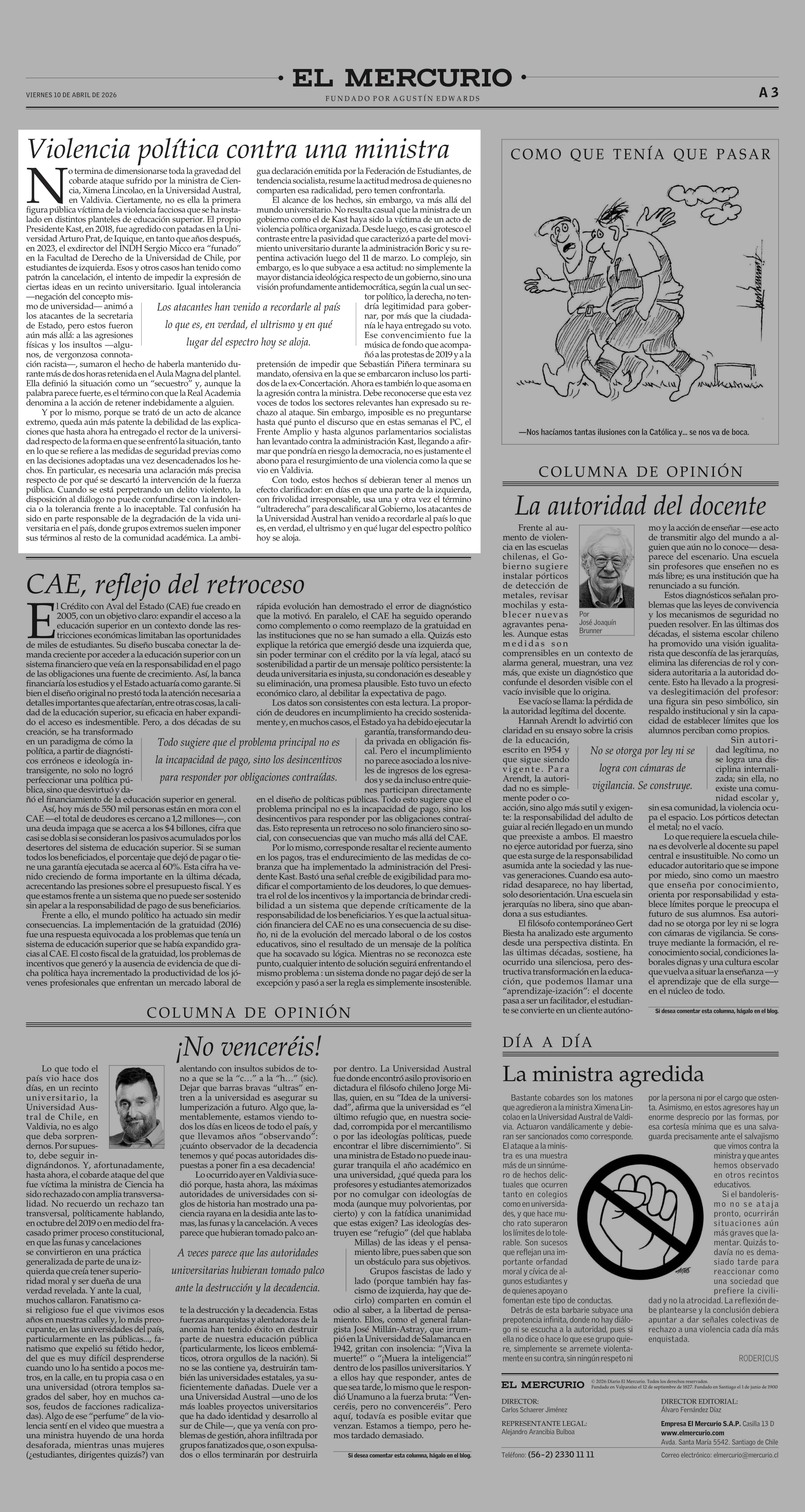 Editorial: Violencia política contra una ministra 10-04-2026 El Mercurio |
