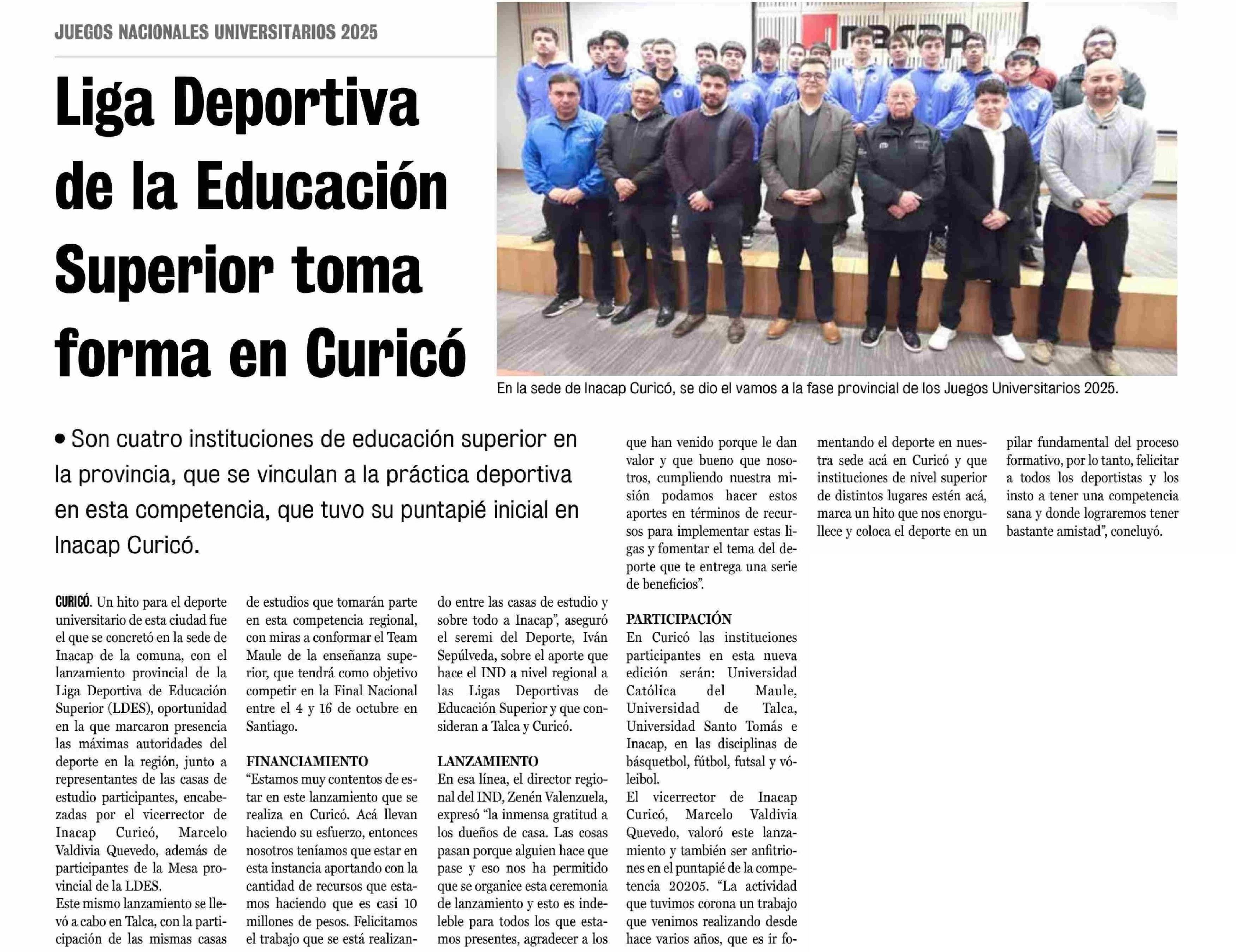Liga Deportiva de la Educación Superior toma forma en Curicó 25-05-2025 La Prensa de Curicó |