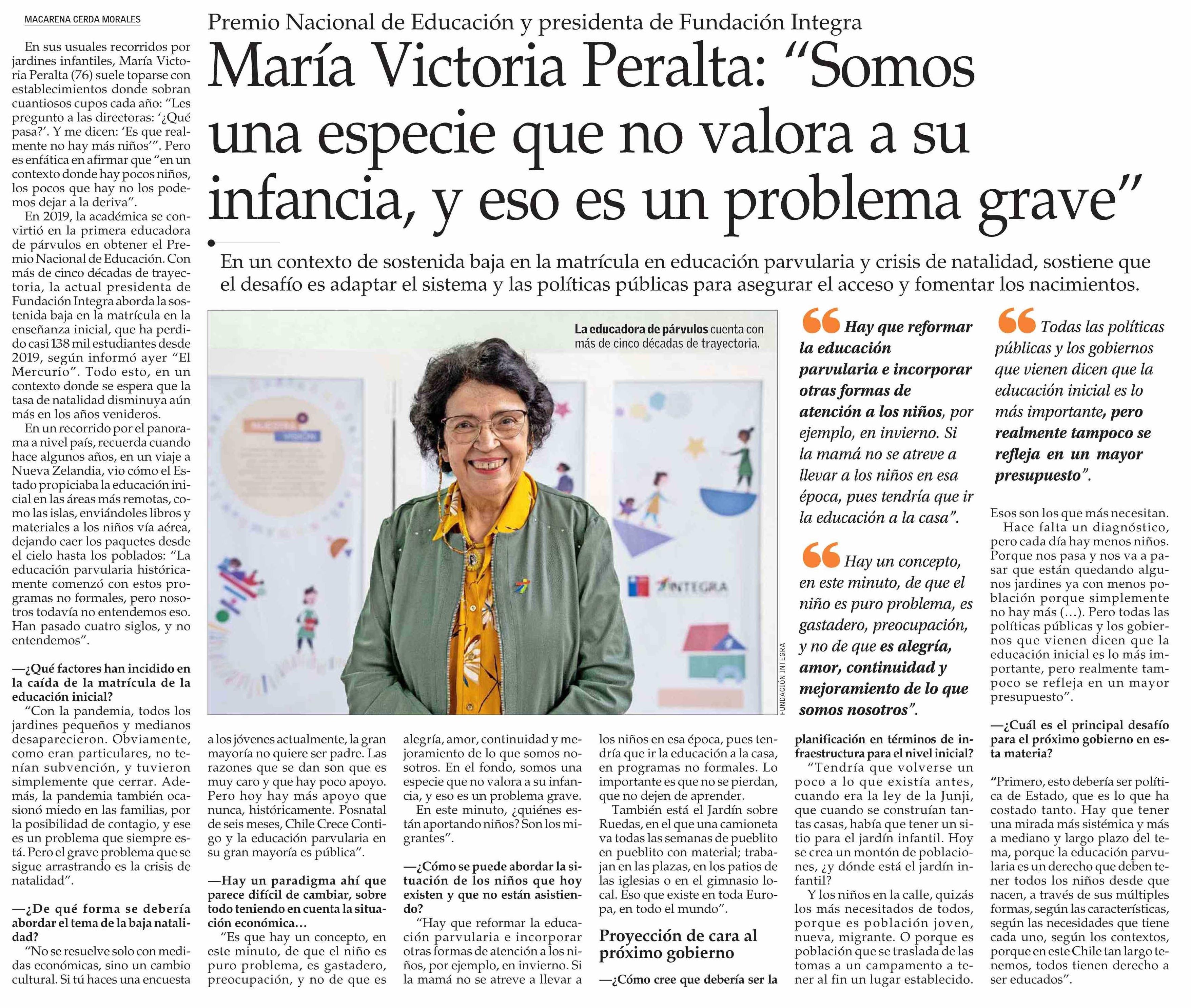 María Victoria Peralta: “Somos una especie que no valora a su infancia, y eso es un problema grave” 14-02-2026 El Mercurio |