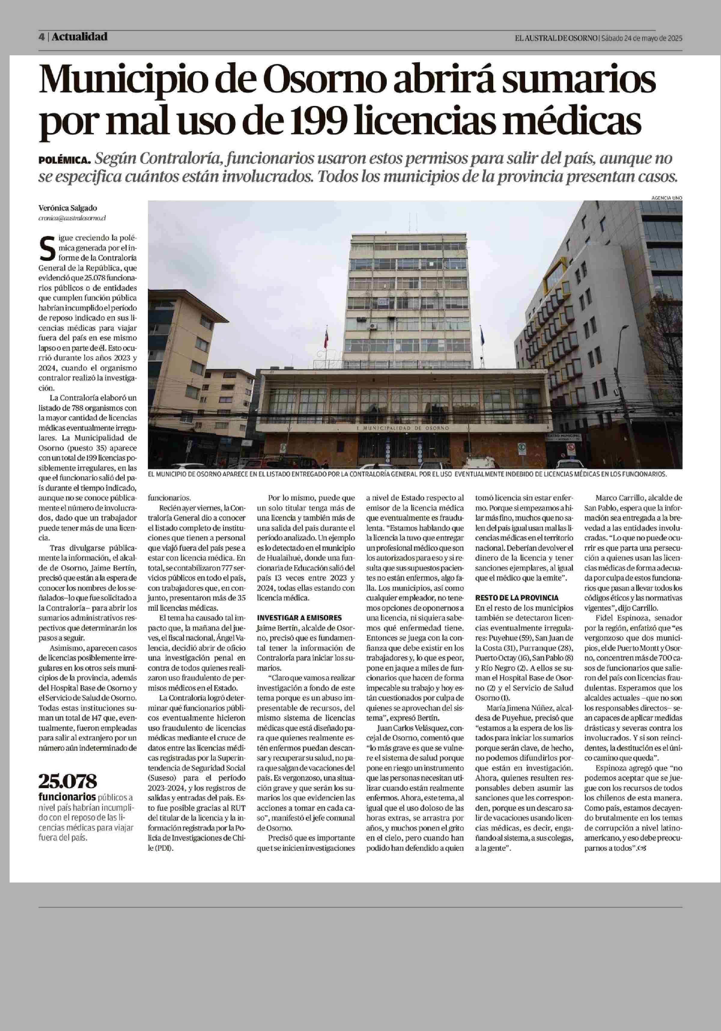Municipio de Osorno abrirá sumarios por mal uso de 199 licencias médicas 24-05-2025 El Austral de Osorno |