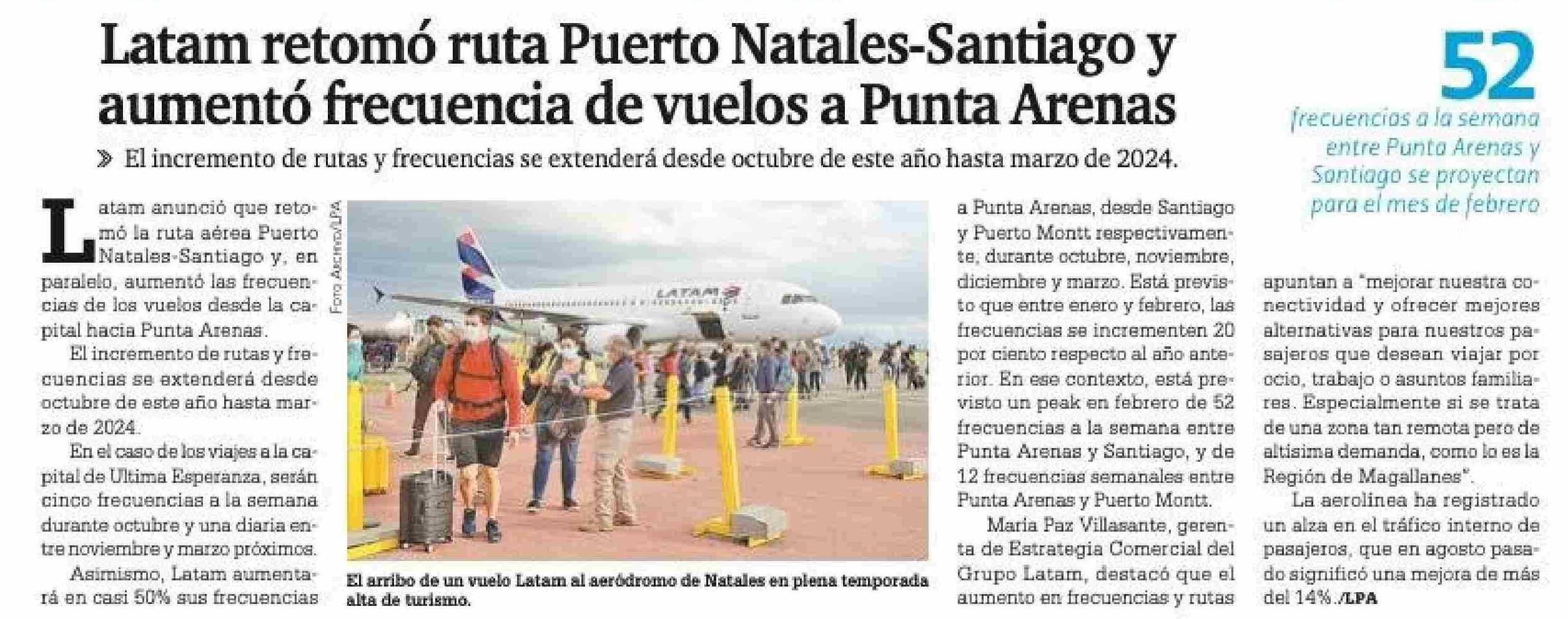 Título: Latam retomó ruta Puerto Natales-Santiago y aumentó frecuencia de vuelos a Punta Arenas