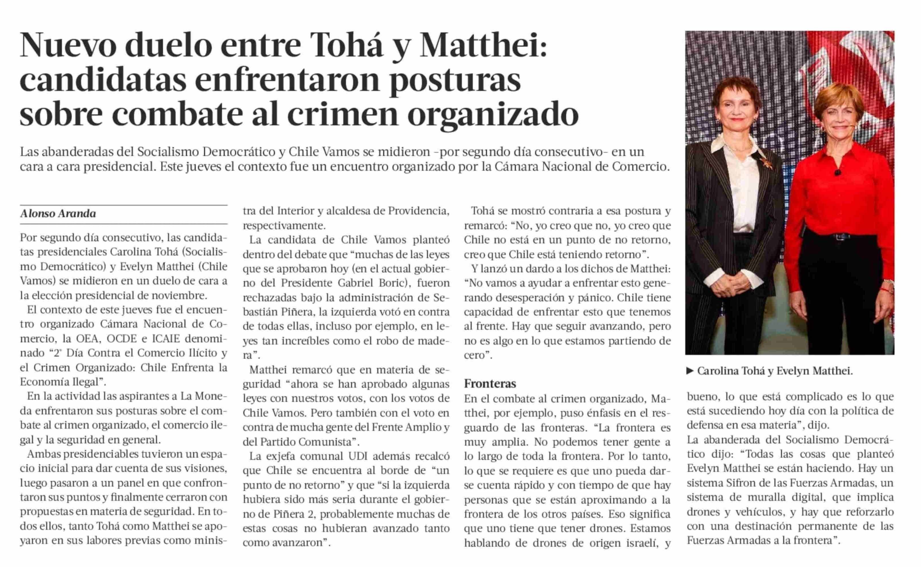 Título: Nuevo duelo entre Tohá y Matthei: candidatas enfrentaron posturas sobre combate al crimen organizado