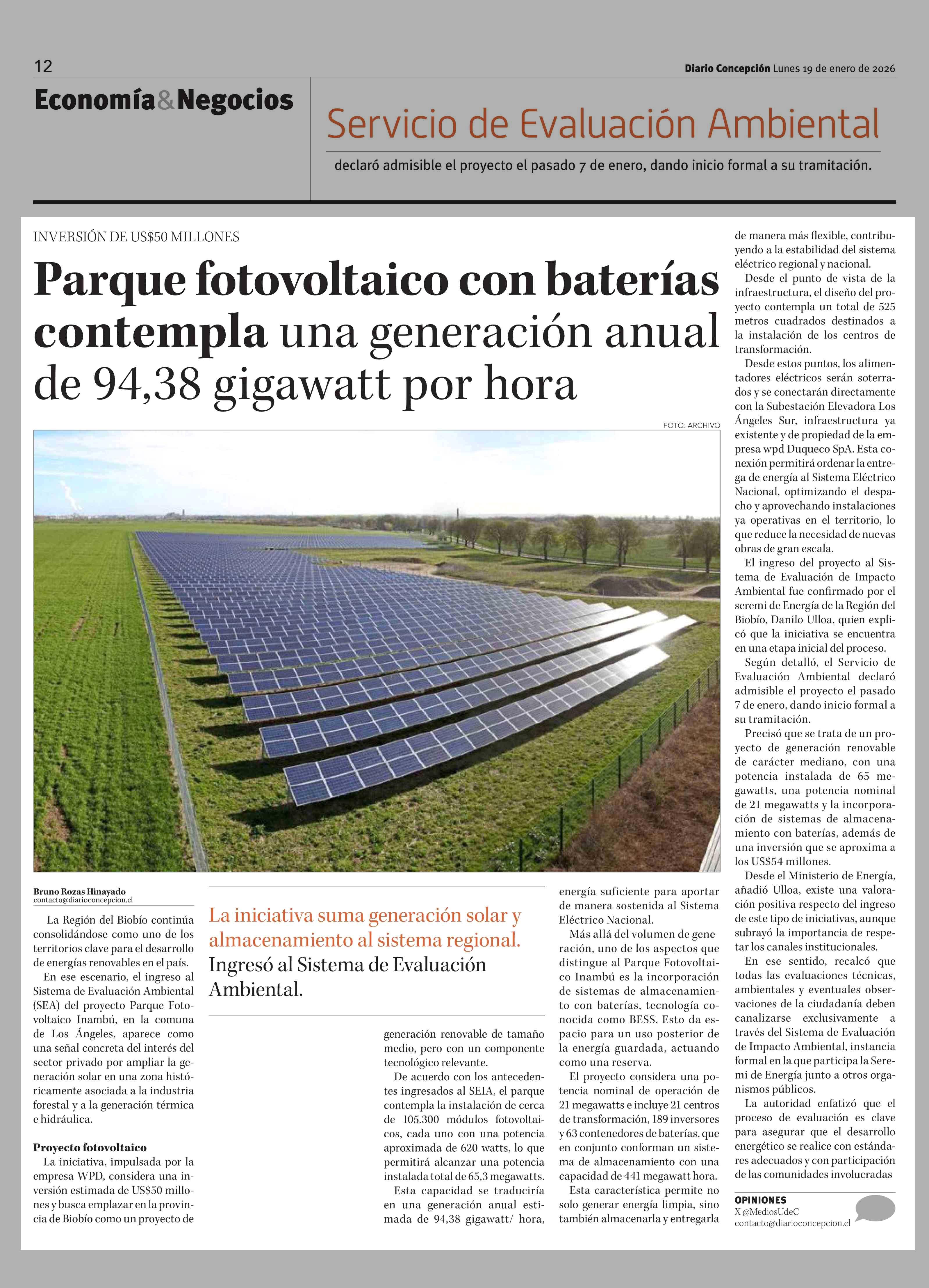 Parque fotovoltaico con baterías contempla una generación anual de 94,38 gigawatt por hora 19-01-2026 Diario Concepción |