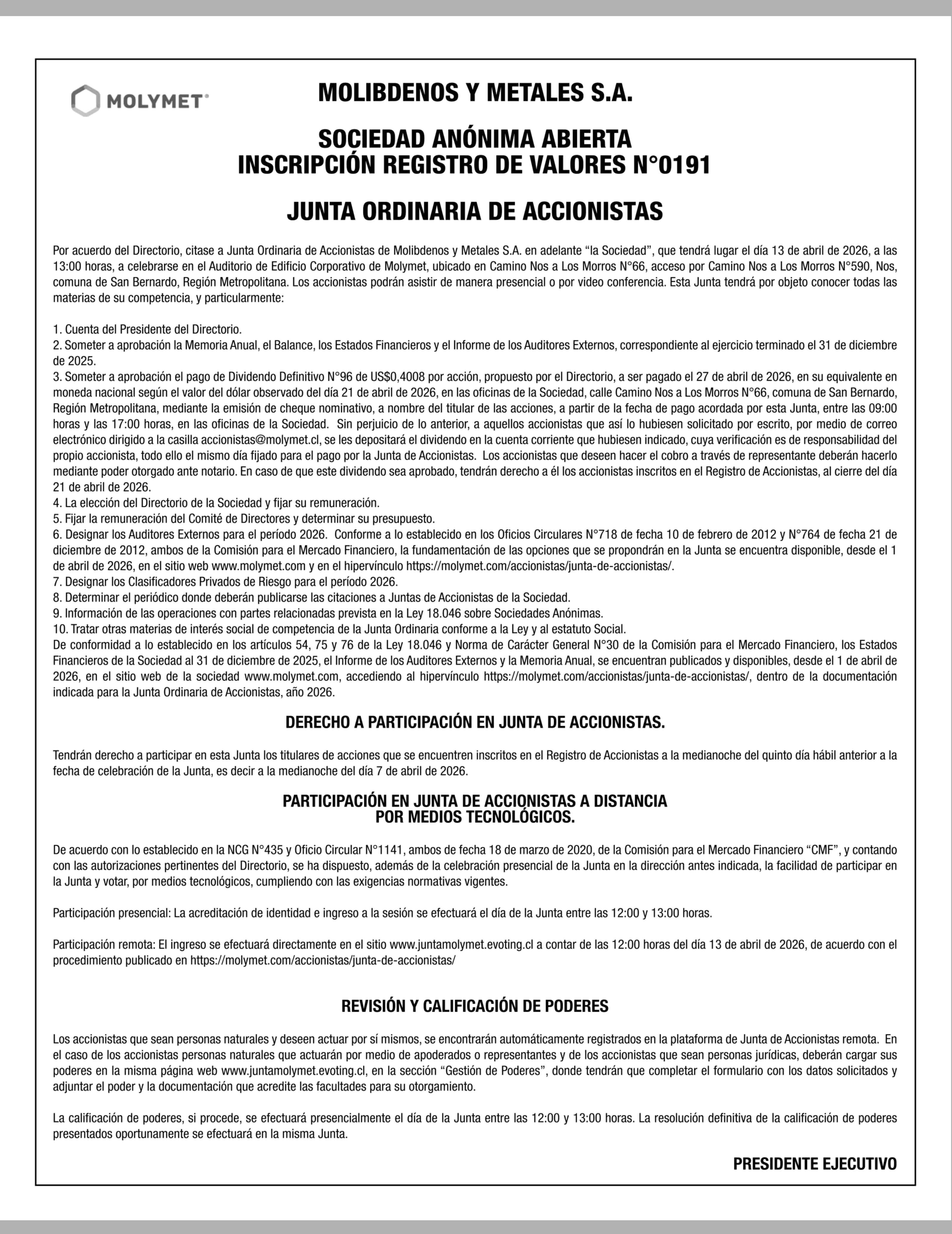 MOLIBDENOS Y METALES S.A. INSCRIPCIÓN REGISTRO DE VALORES Nº0191 09-04-2026 La Segunda |