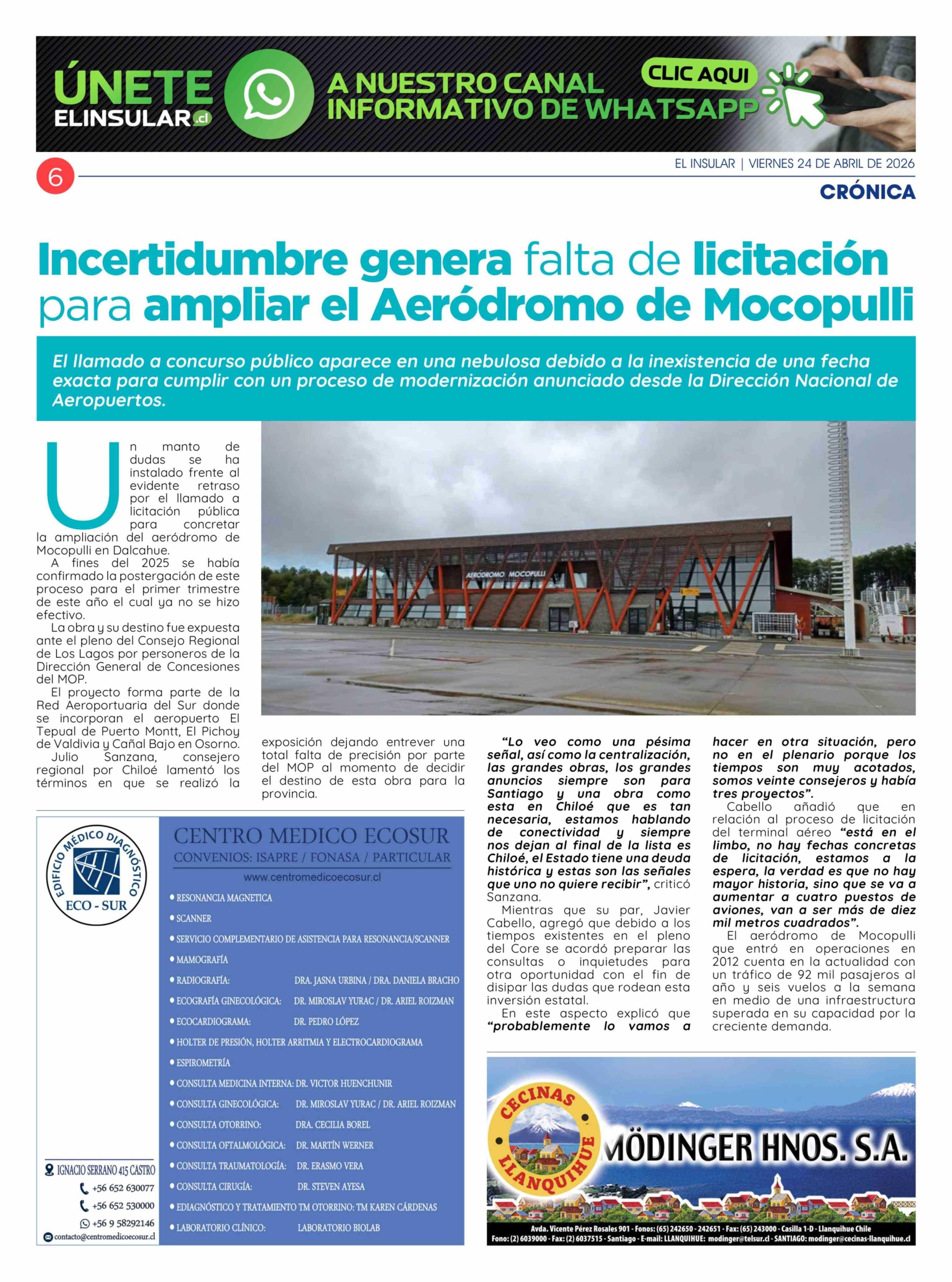 Incertidumbre genera falta de licitación para ampliar el Aeródromo de Mocopulli 24-04-2026 El Insular |