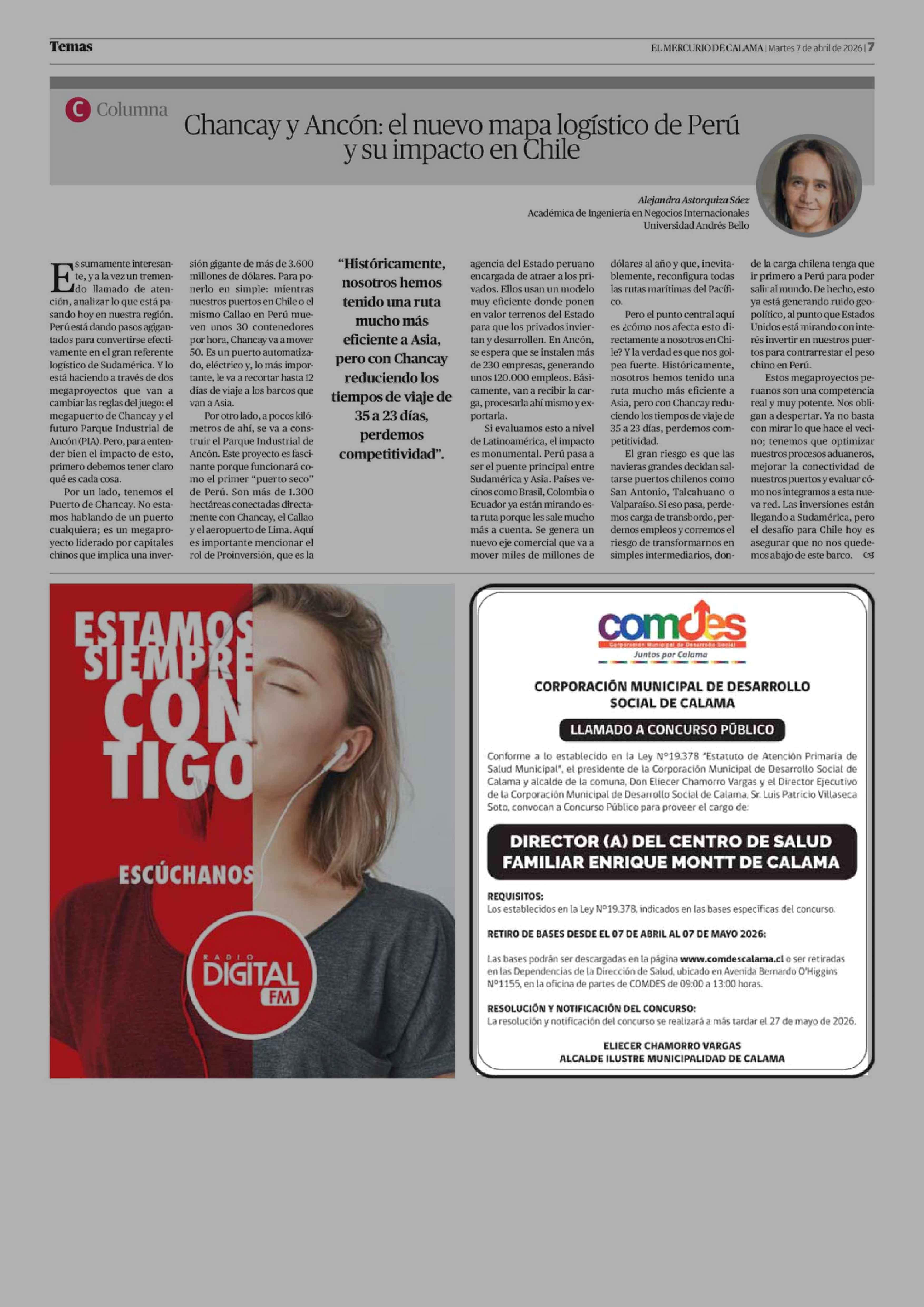 CORPORACIÓN MUNICIPAL DE DESARROLLO SOCIAL DE CALAMA LLAMADO A CONCURSO PÚBLICO 07-04-2026 El Mercurio de Calama |