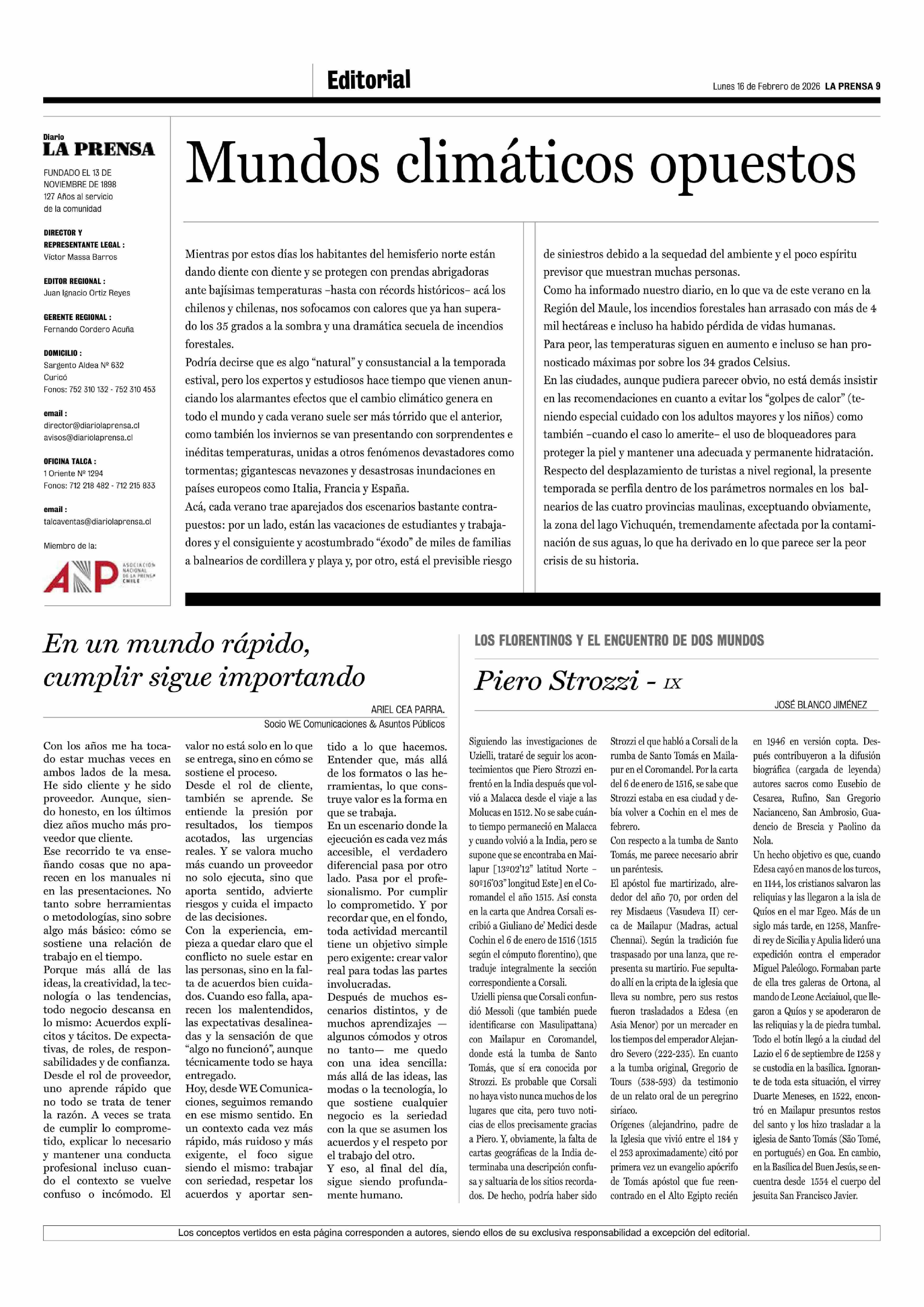 Editorial: Mundos climáticos opuestos 16-02-2026 La Prensa de Curicó |