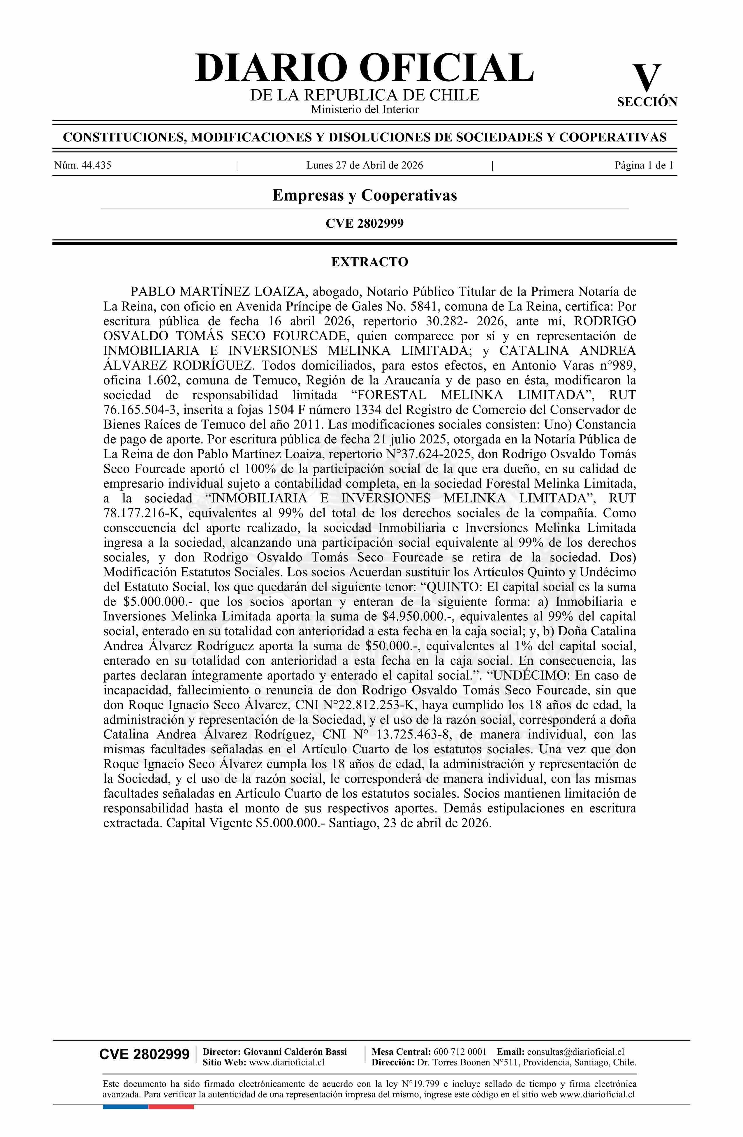 Fuente: Diario Oficial Edición Electrónica (Diario Oficial de Chile - 5 Empresas Y Cooper) Página(s): 85