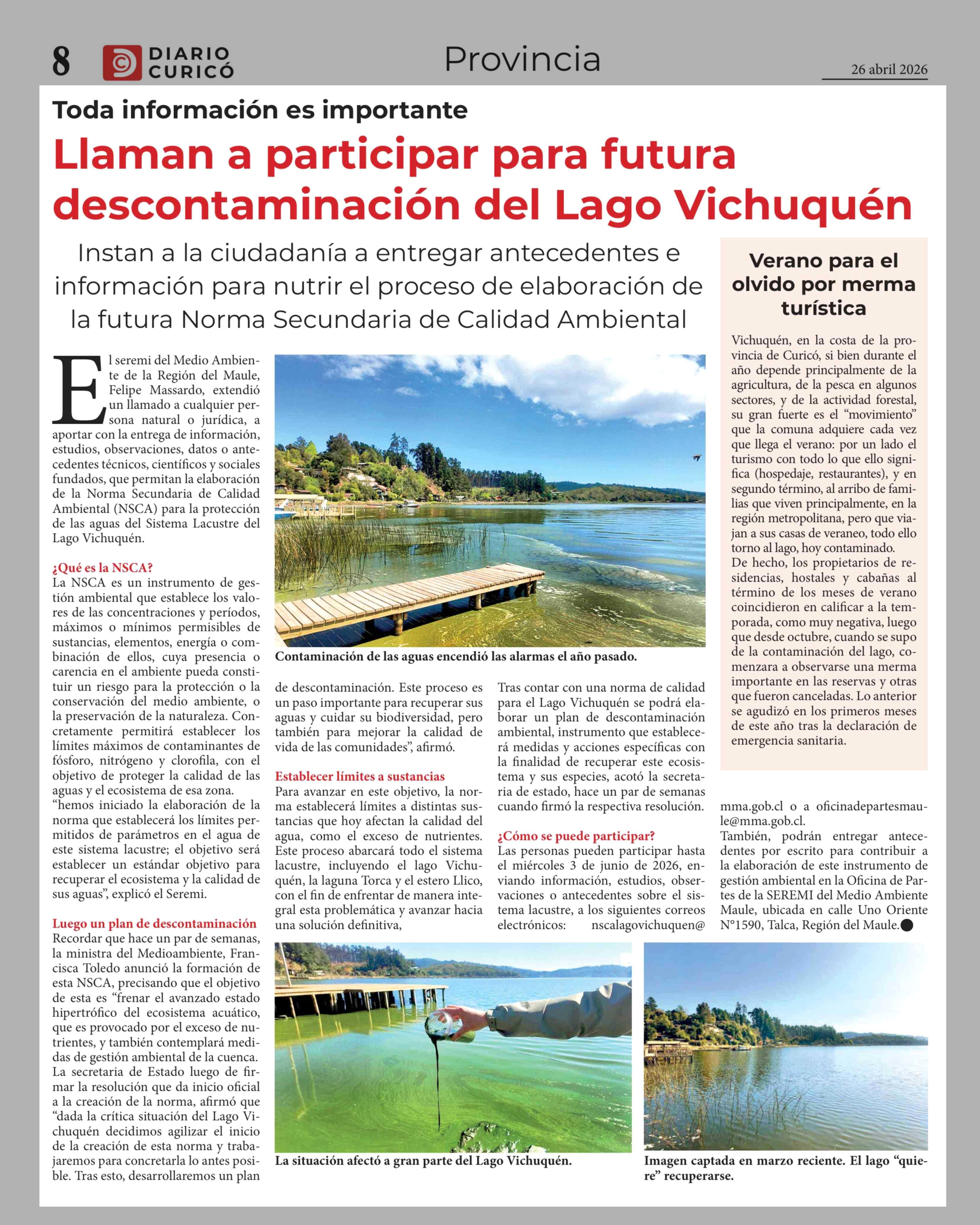 Llaman a participar para futura descontaminación del Lago Vichuquén 26-04-2026 Diario Talca |