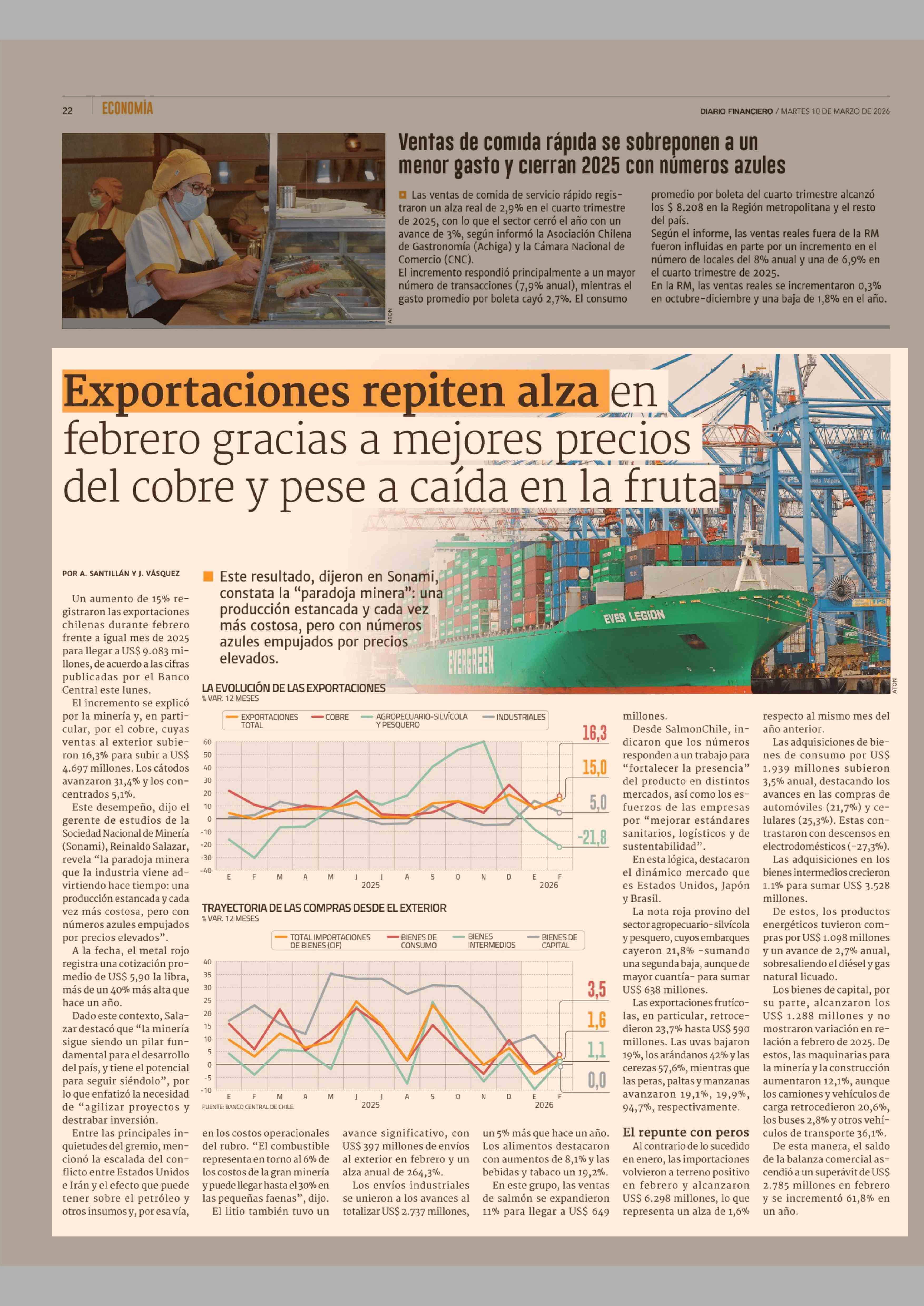 Exportaciones repiten alza en febrero gracias a mejores precios del cobre y pese a caída en la fruta 10-03-2026 Diario Financiero |