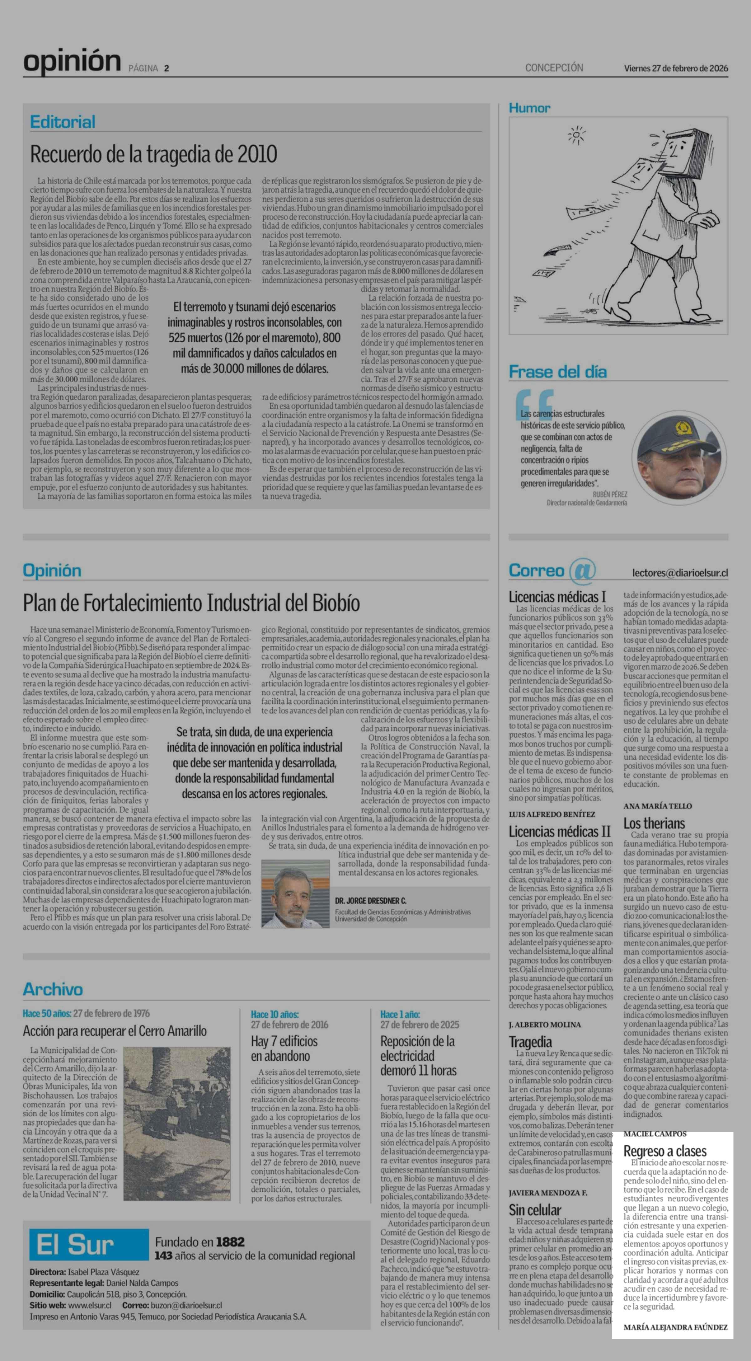Cartas: Regreso a clases 27-02-2026 El Sur |
