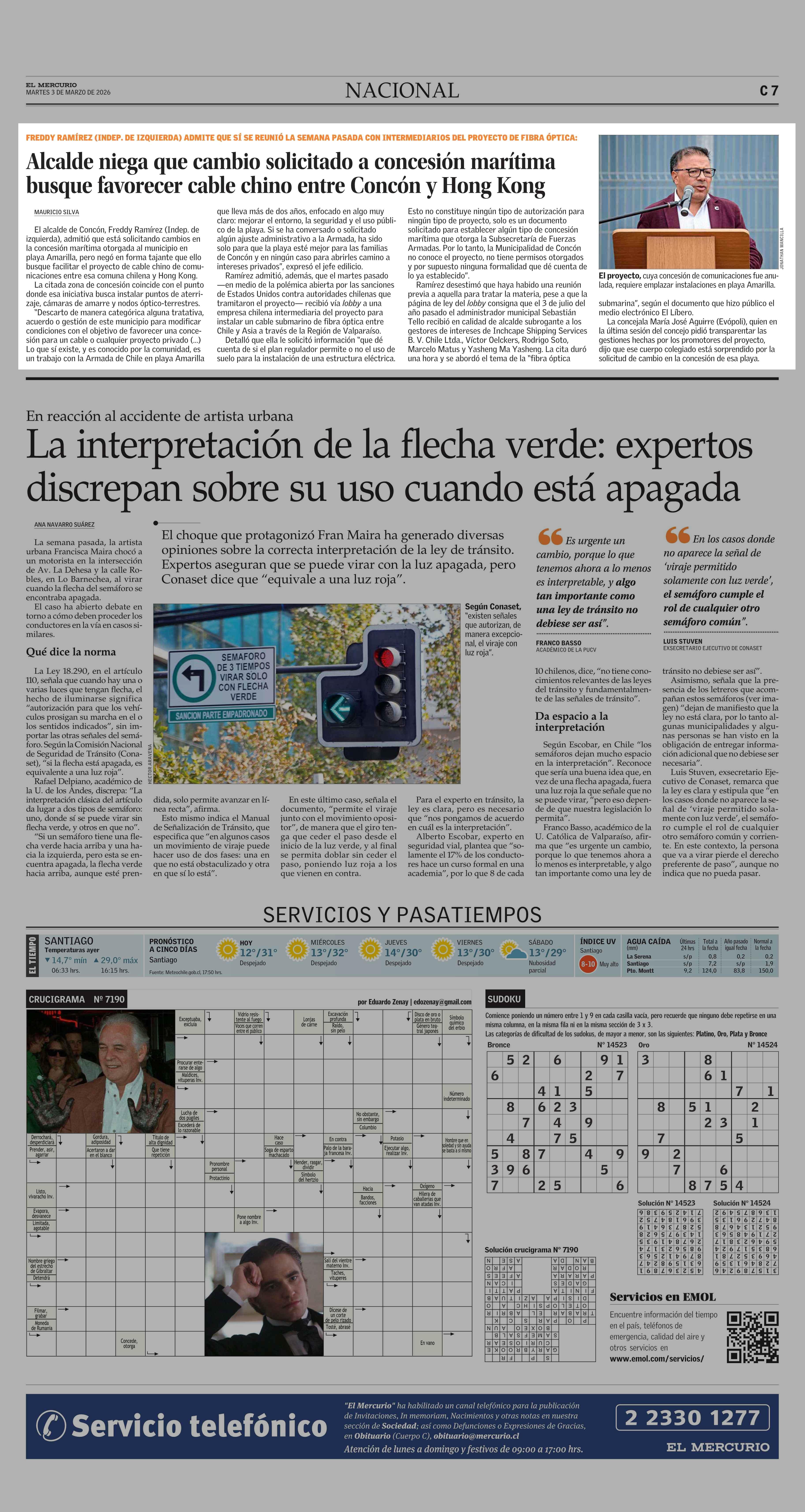 Alcalde niega que cambio solicitado a concesión marítima busque favorecer cable chino entre Concón y Hong Kong 03-03-2026 El Mercurio |