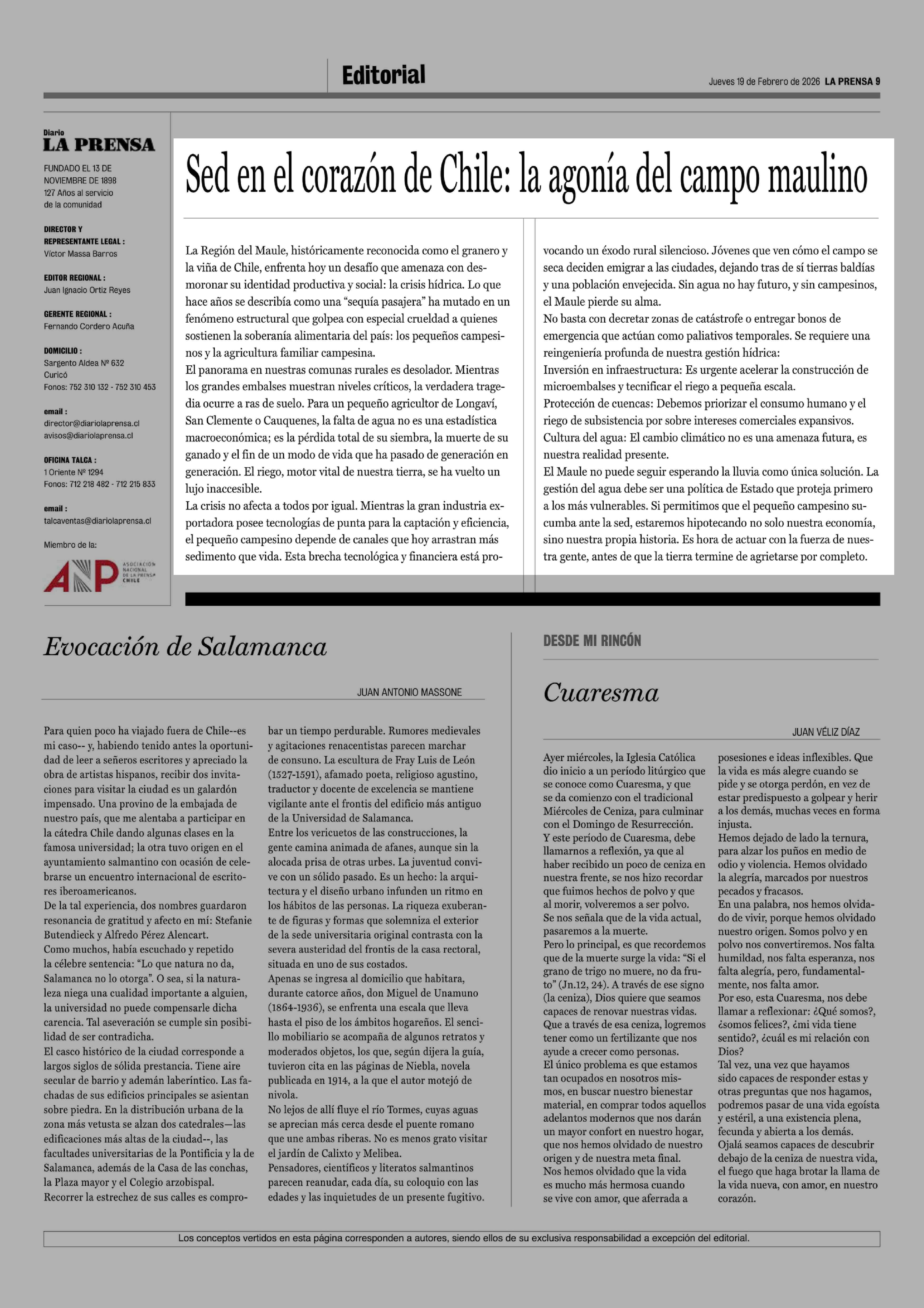 Editorial: Sed en el corazón de Chile: la agonía del campo maulino 19-02-2026 La Prensa de Curicó |