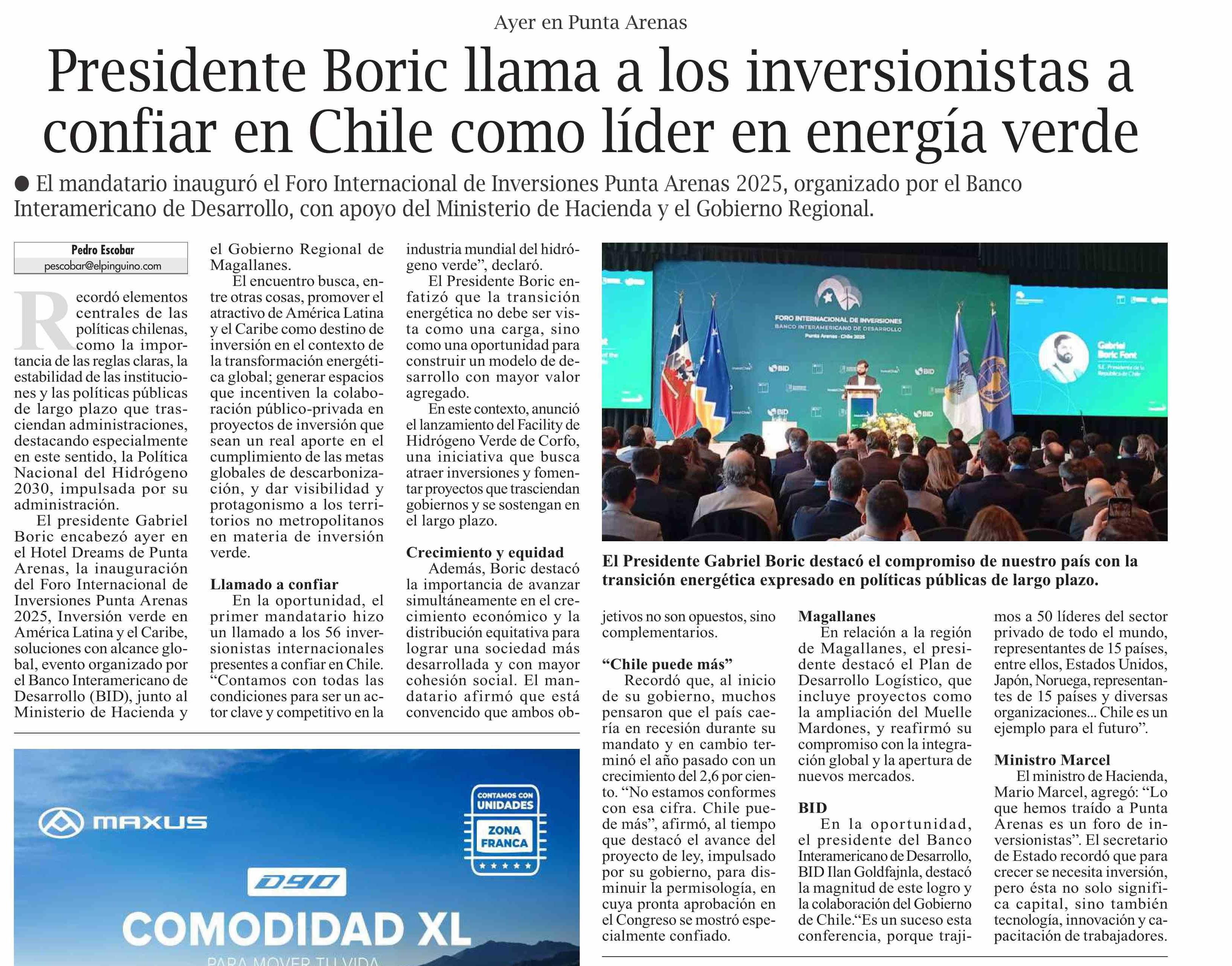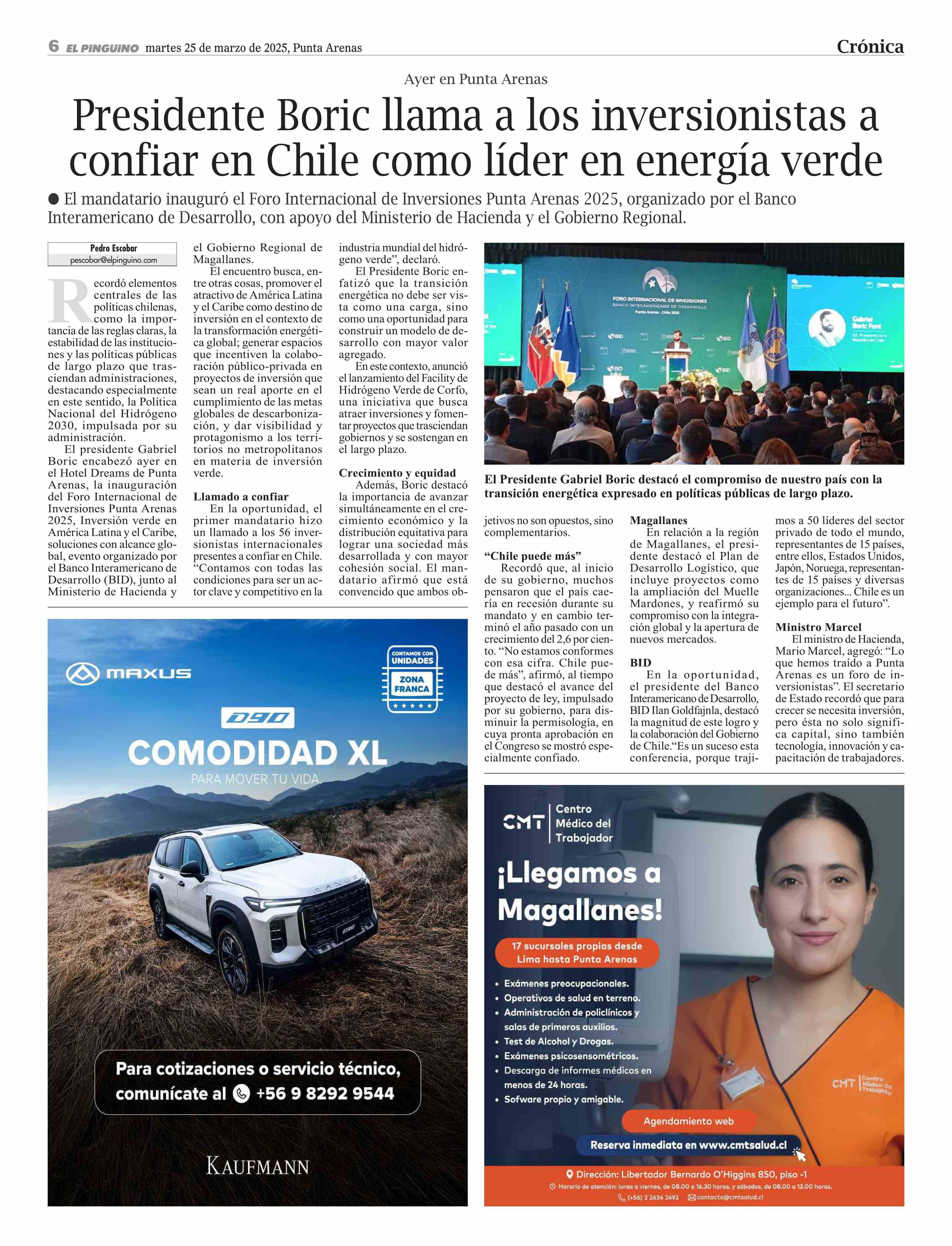 Presidente Boric llama a los inversionistas a confiar en Chile como líder en energía verde 25-03-2025 El Pingüino |