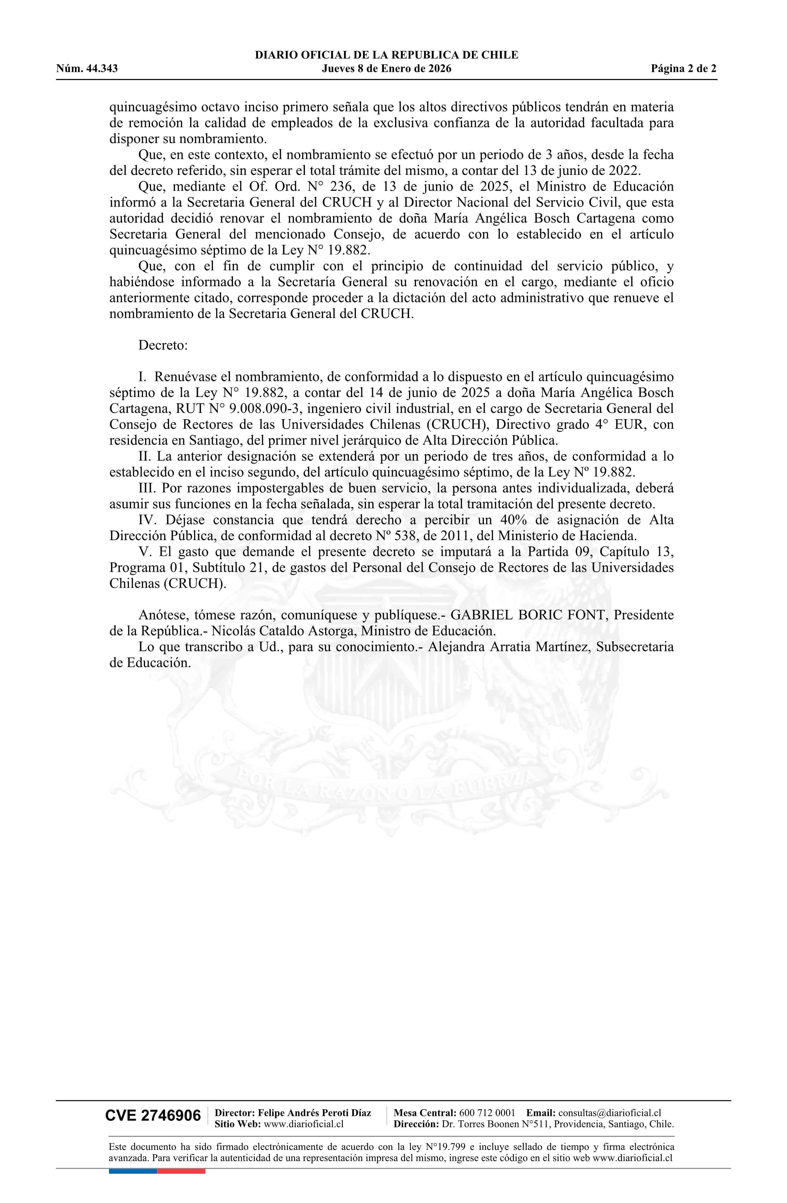 Decreto número 89, de 2025.- Renueva designación de doña María Angélica Bosch Cartagena en el cargo de Secretaria General del Consejo de Rectores de Chile 08-01-2026 DIARIO OFICIAL CHILE - BOLETÍN OFICIAL DE MINERÍA |