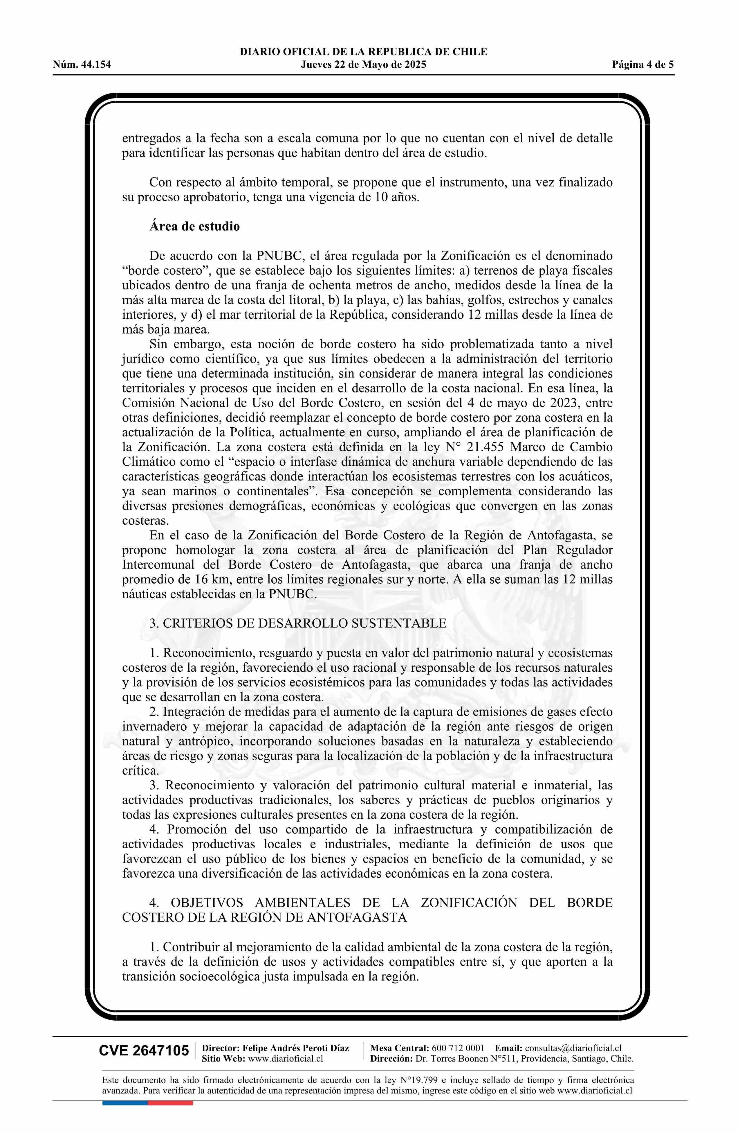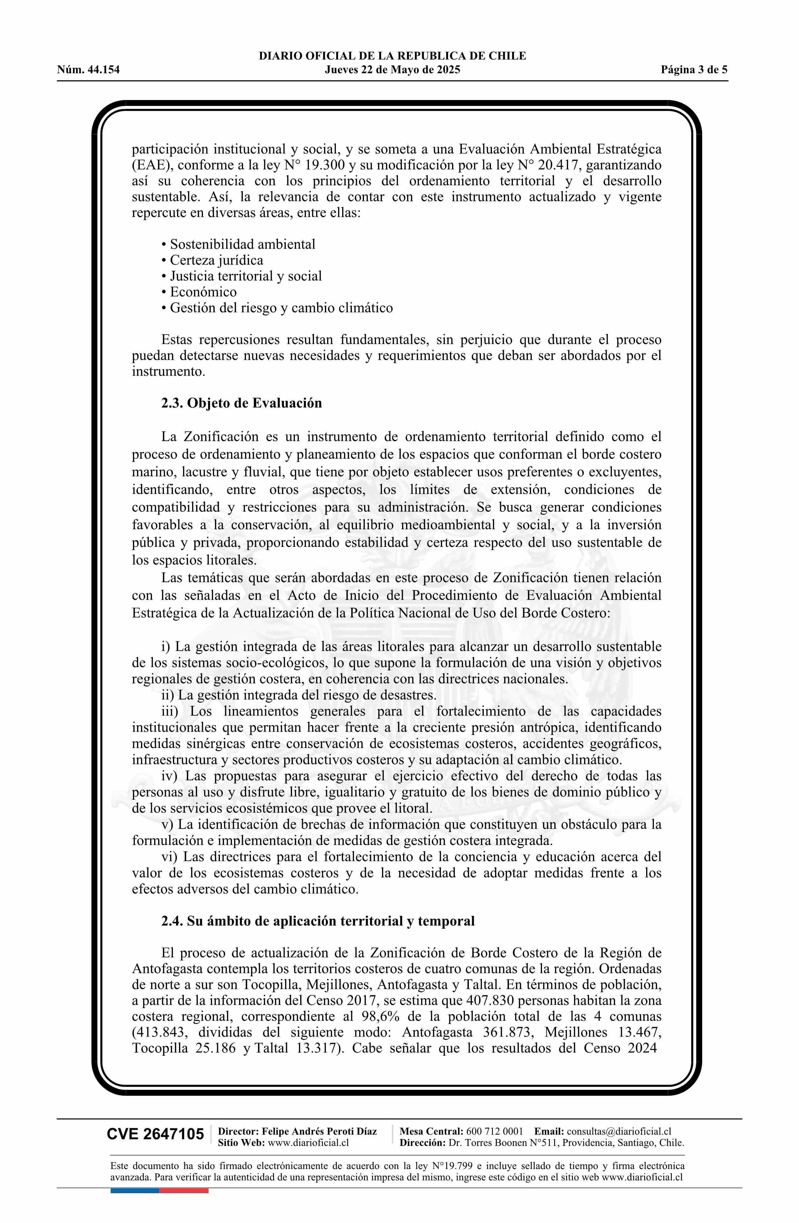 AVISO LICITACIONES: Inicia elaboración de la Zonificación del Borde Costero de la Región de Antofagasta y su Evaluación Ambiental Estratégica 22-05-2025 Diario Oficial Edición Electrónica |