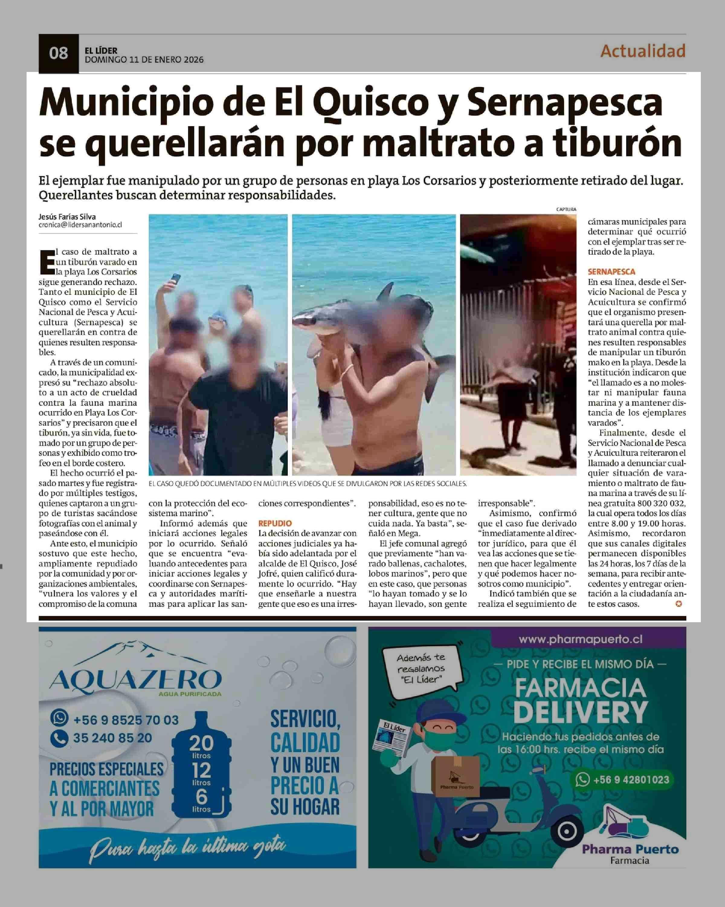 Municipio de El Quisco y Sernapesca se querellarán por maltrato a tiburón 11-01-2026 El Líder |
