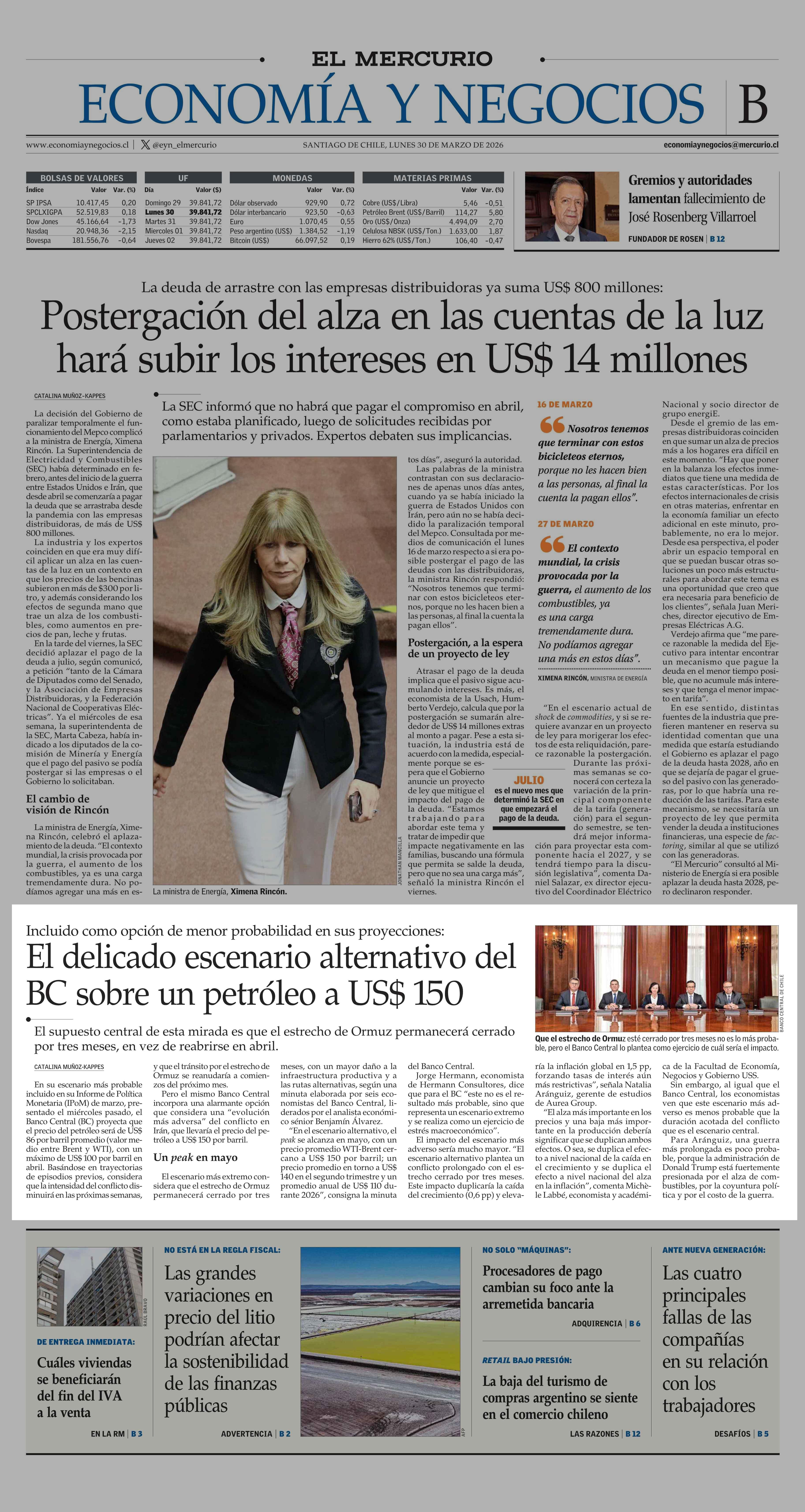 El delicado escenario alternativo del BC sobre un petróleo a US$ 150 30-03-2026 El Mercurio |