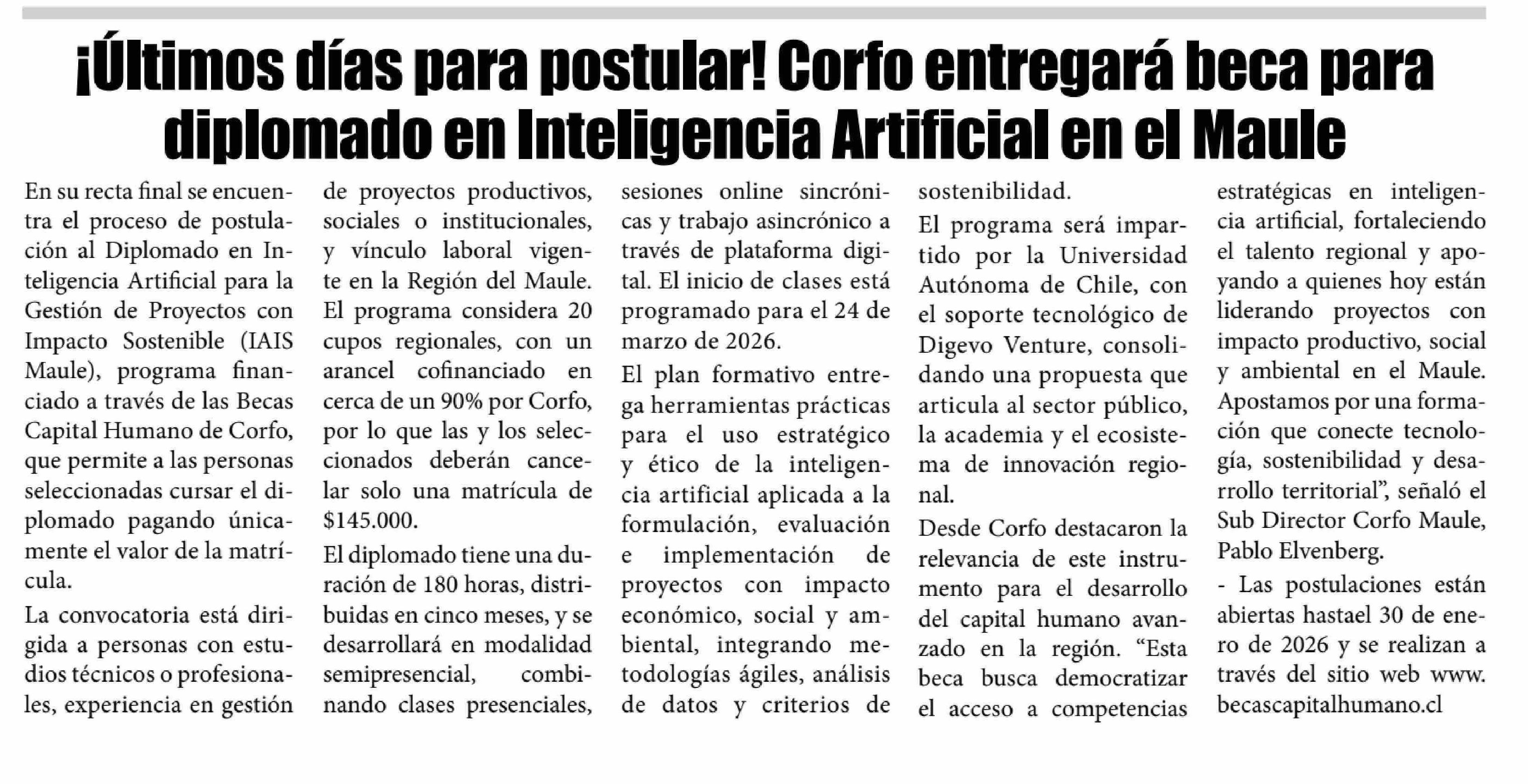 ¡ últimos días para postular! Corfo entregará beca para diplomado en inteligencia Artificial en el Maule 28-01-2026 El Lector |