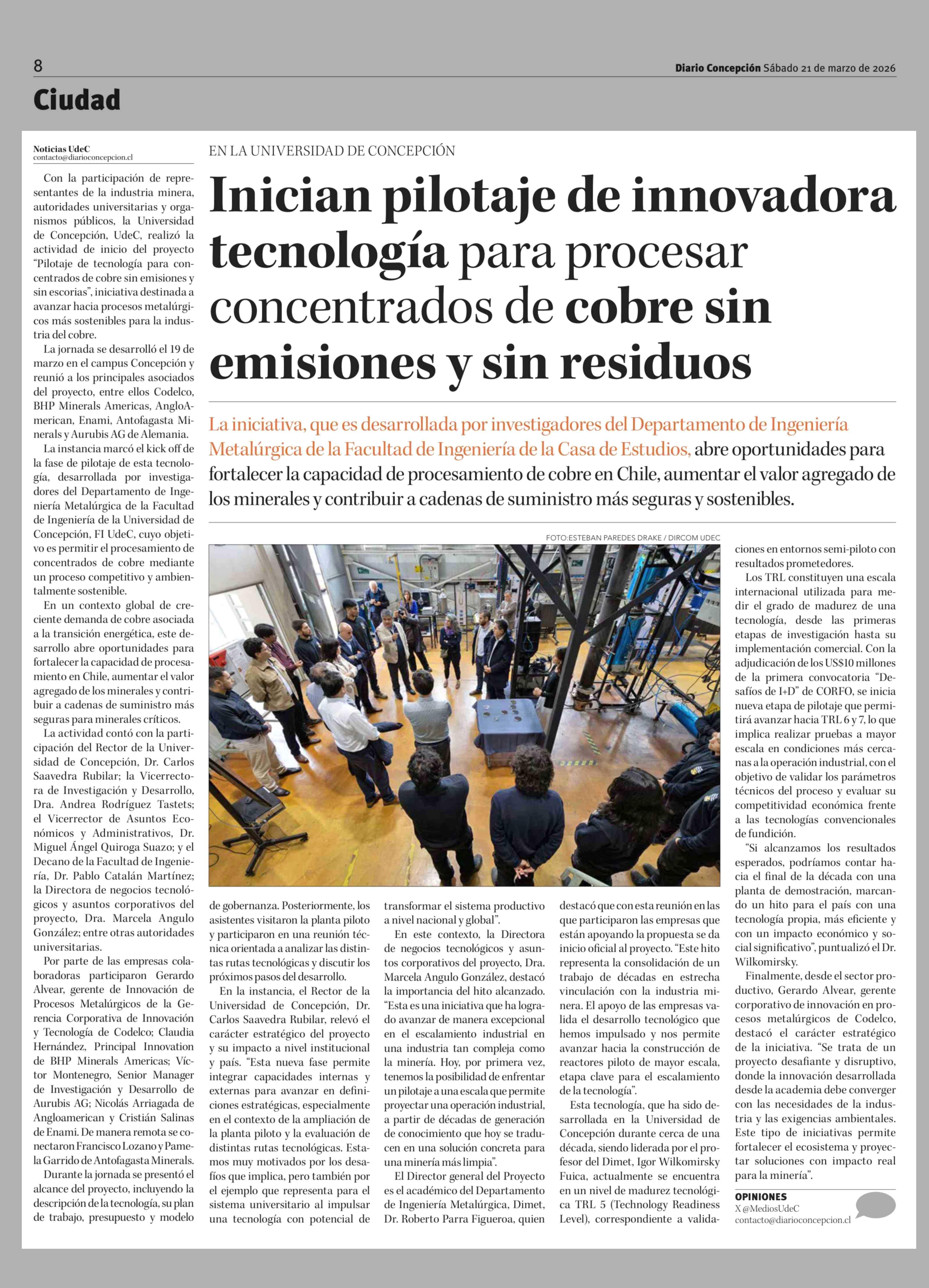 Inician pilotaje de innovadora tecnología para procesar concentrados de cobre sin emisiones y sin residuos 21-03-2026 Diario Concepción |