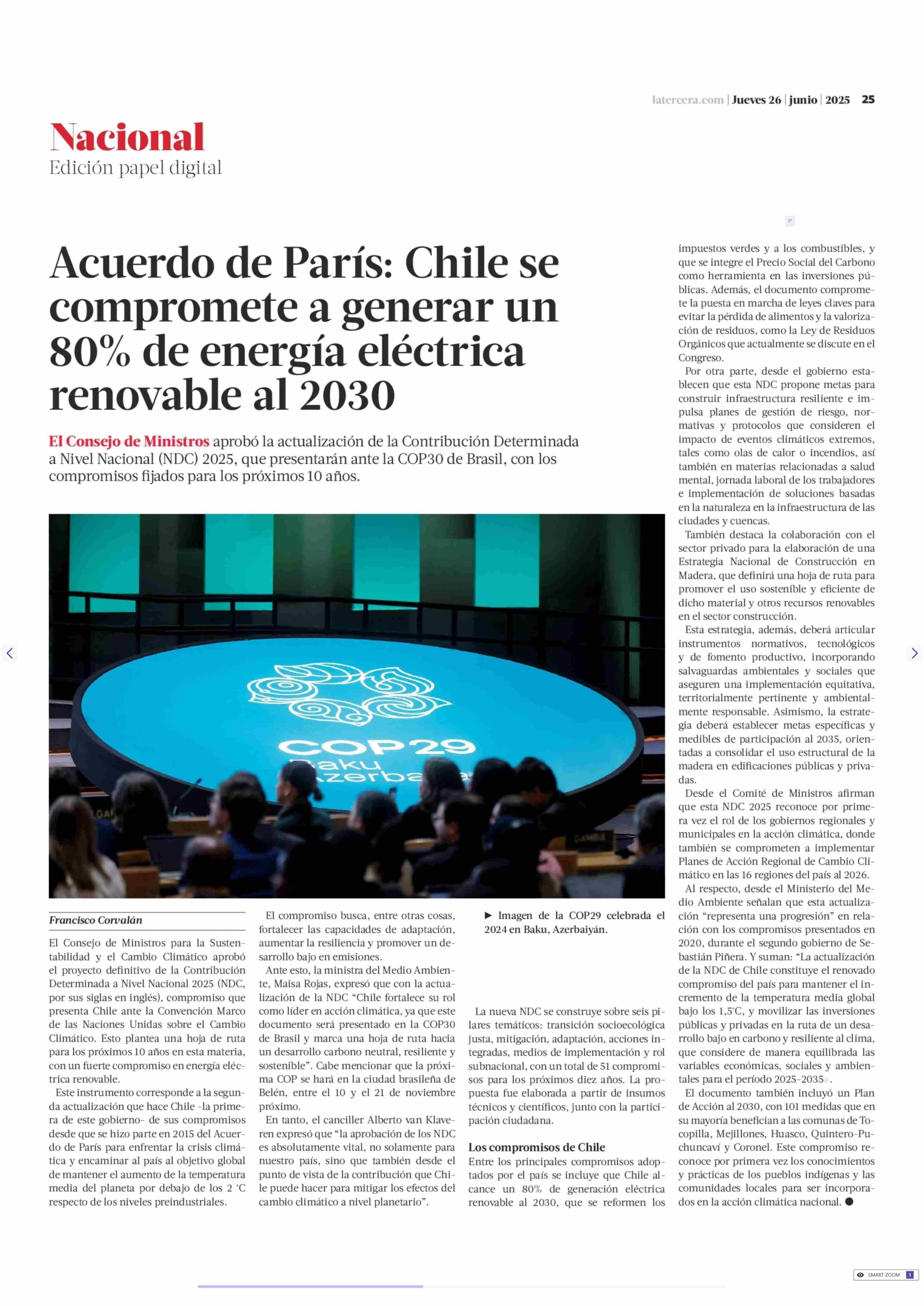 Acuerdo de París: Chile se compromete a generar un 80% de energía eléctrica renovable al 2030 26-06-2025 La Tercera |