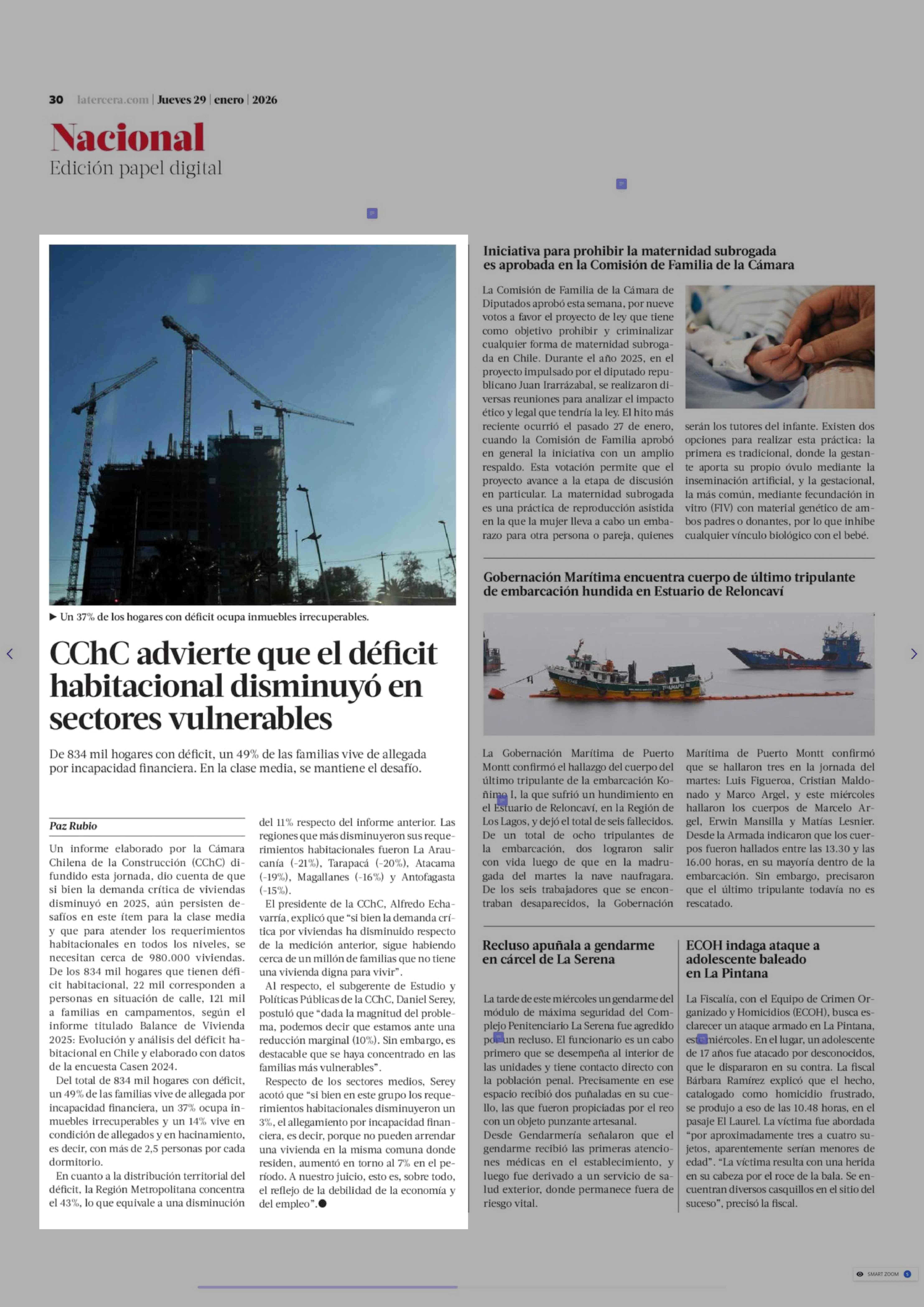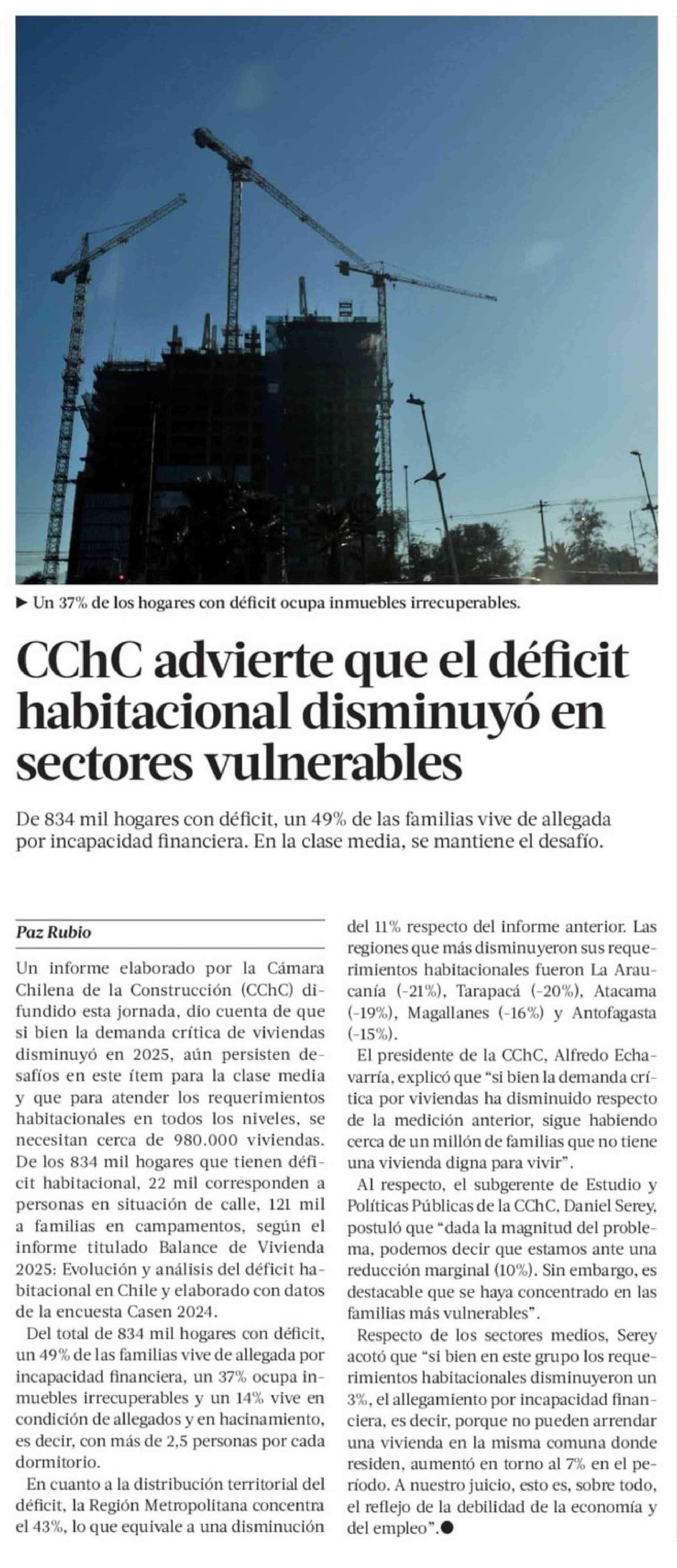 CChC advierte que el déficit habitacional disminuyó en sectores vulnerables 29-01-2026 La Tercera |