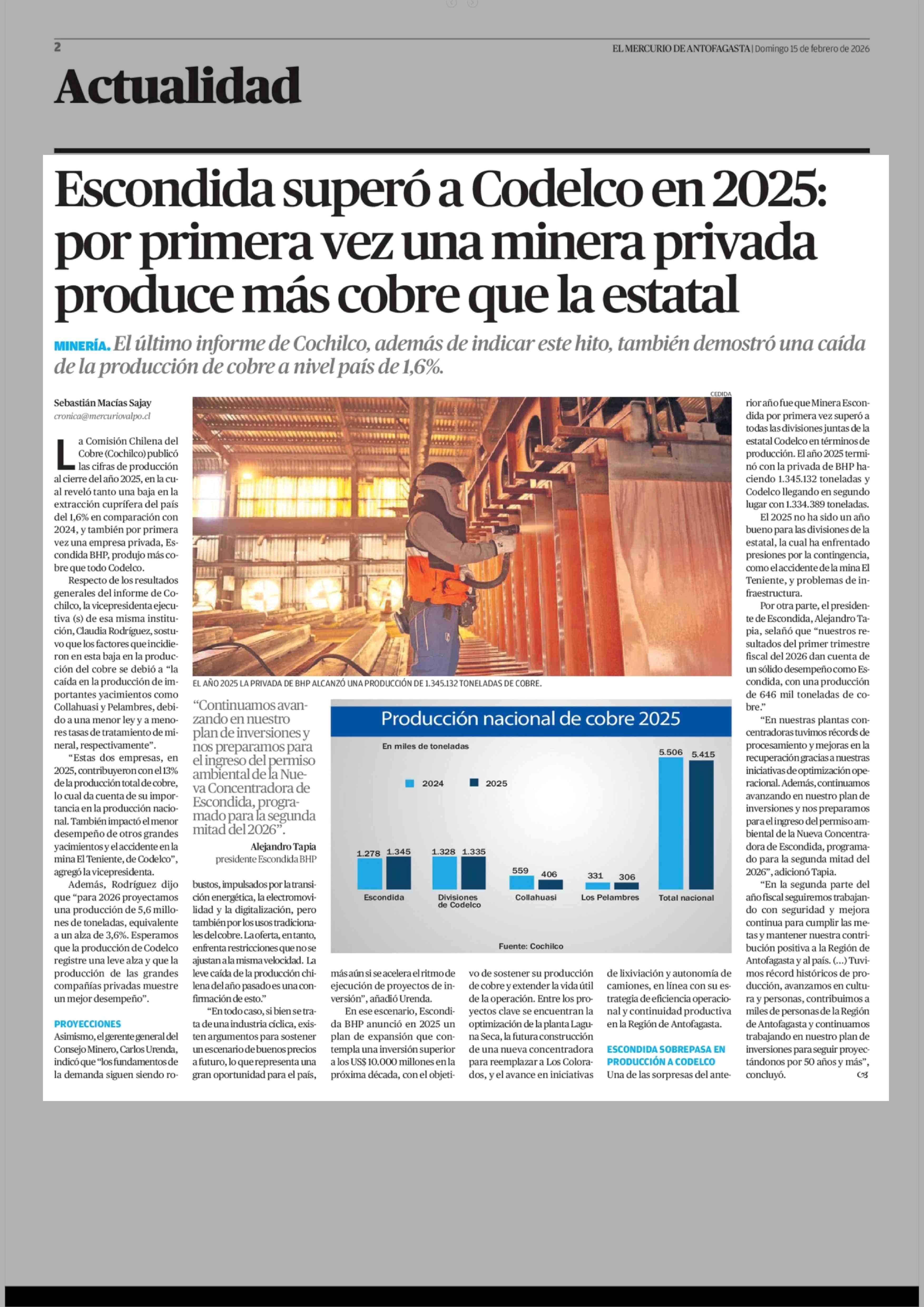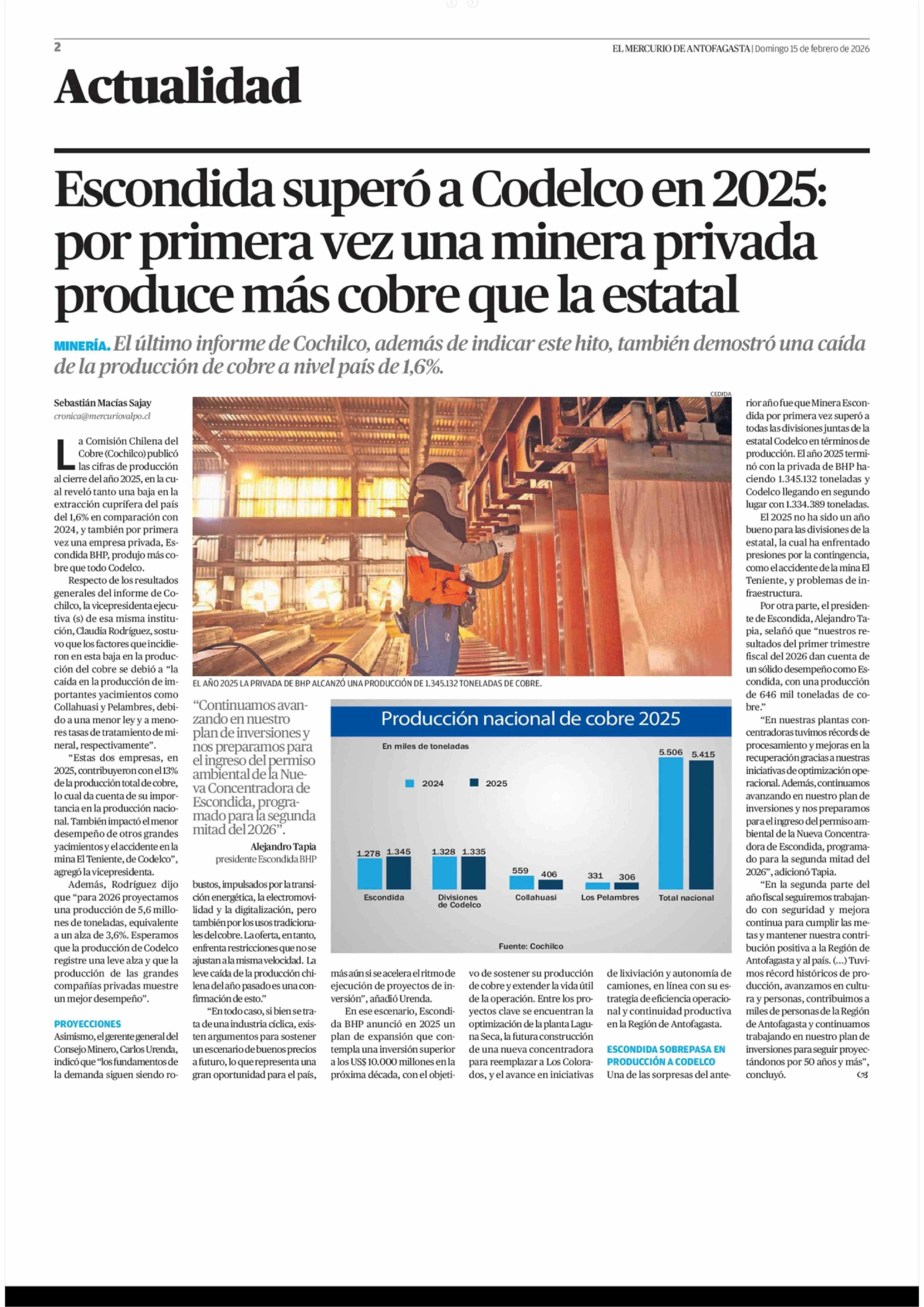 Título: Escondida superó a Codelco en 2025: por primera vez una minera privada produce más cobre que la estatal