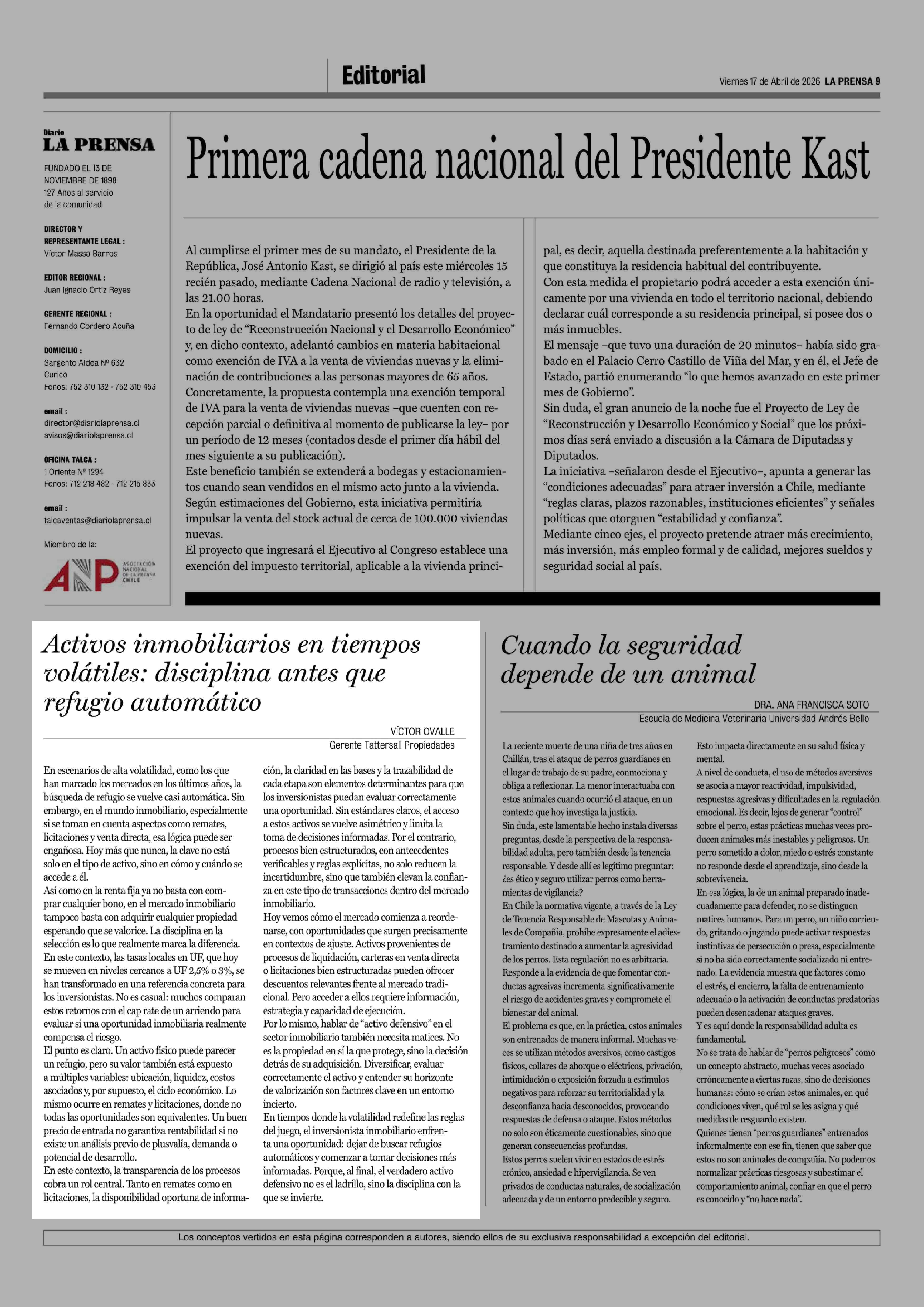 Cartas: Activos inmobiliarios en tiempos volátiles: disciplina antes que refugio automático 17-04-2026 La Prensa de Curicó |