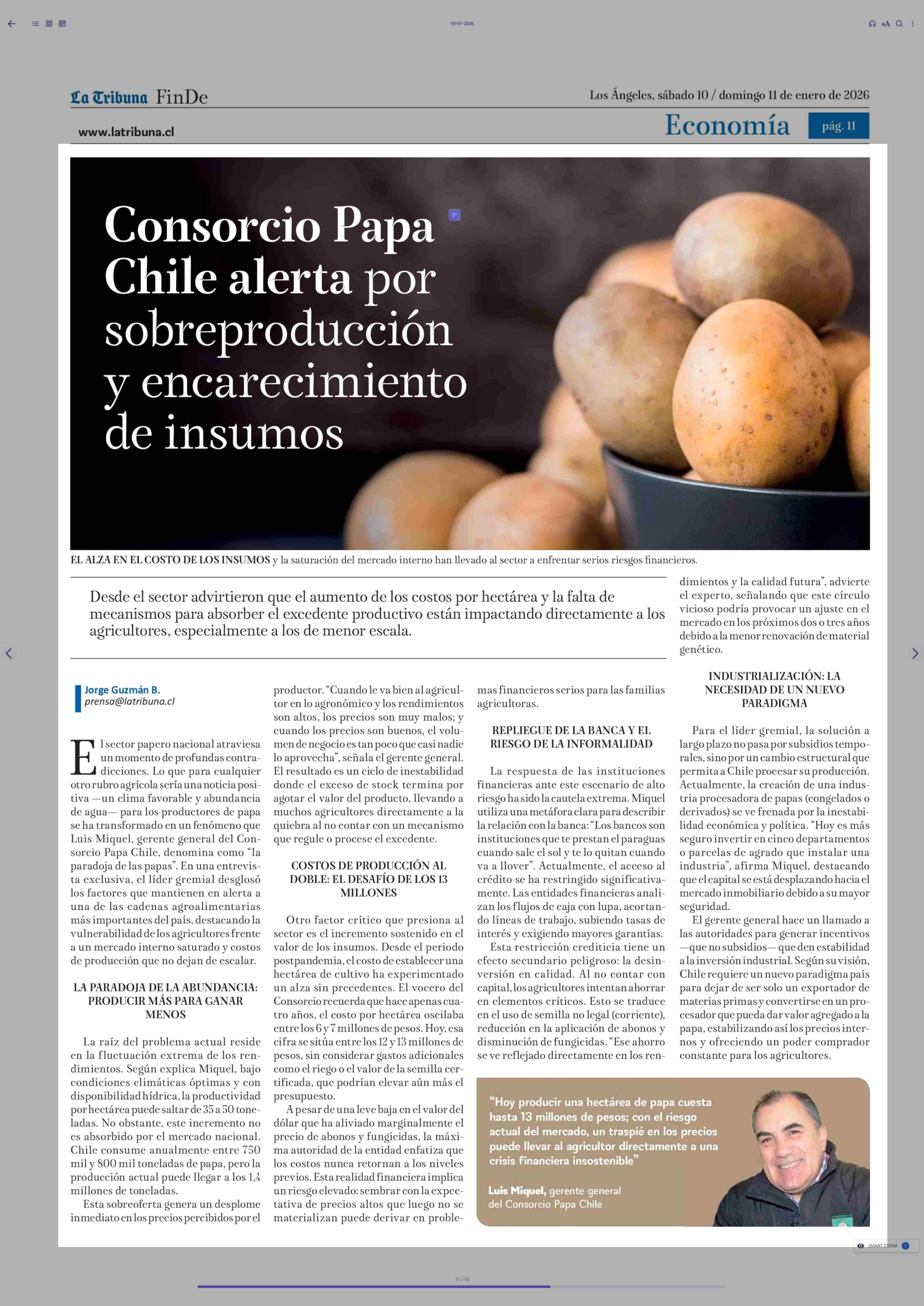 Consorcio Papa Chile alerta por sobreproducción y encarecimiento de insumos 10-01-2026 La Tribuna |