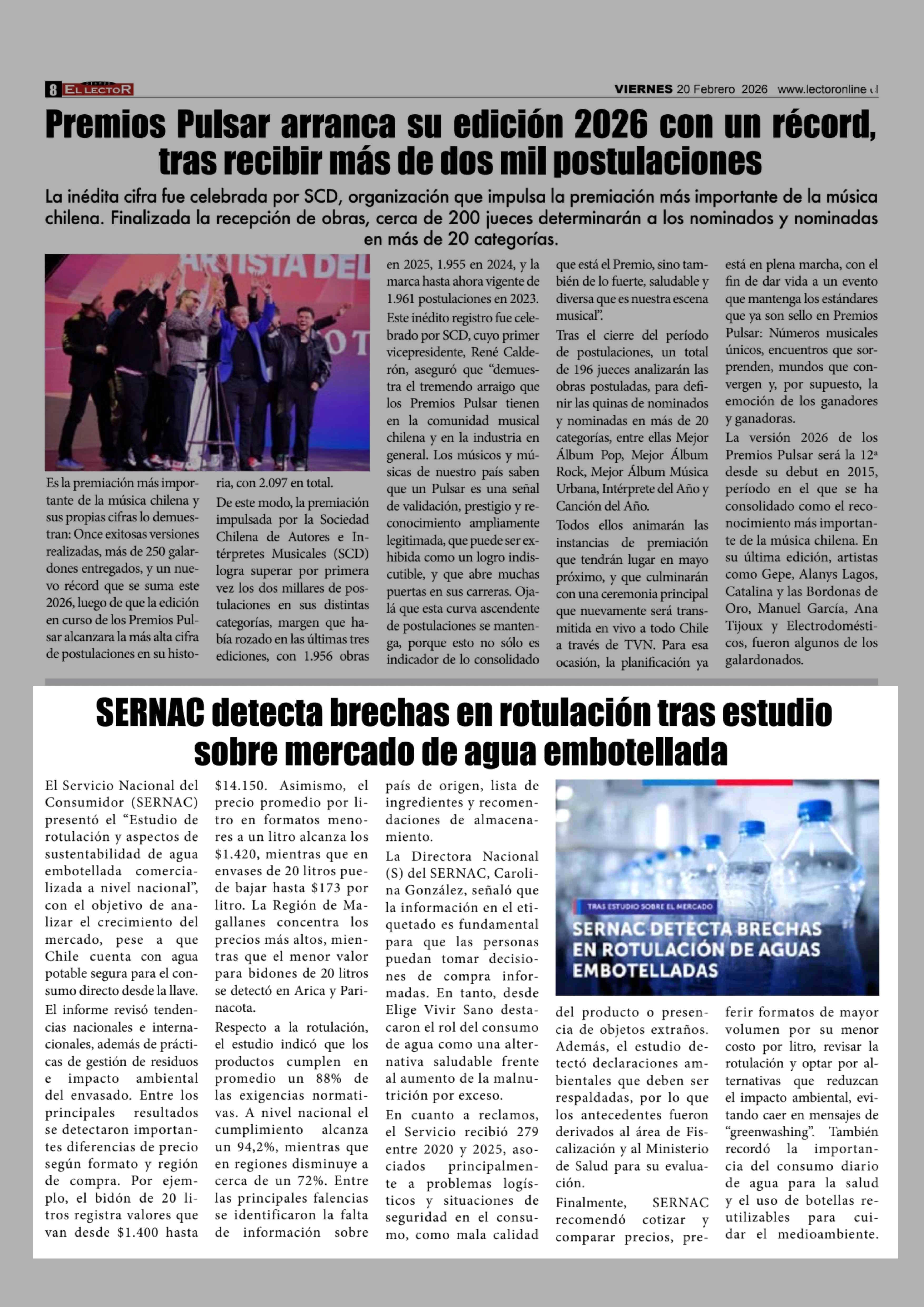 SERNAC detecta brechas en rotulación tras estudio sobre mercado de agua embotellada 20-02-2026 El Lector |
