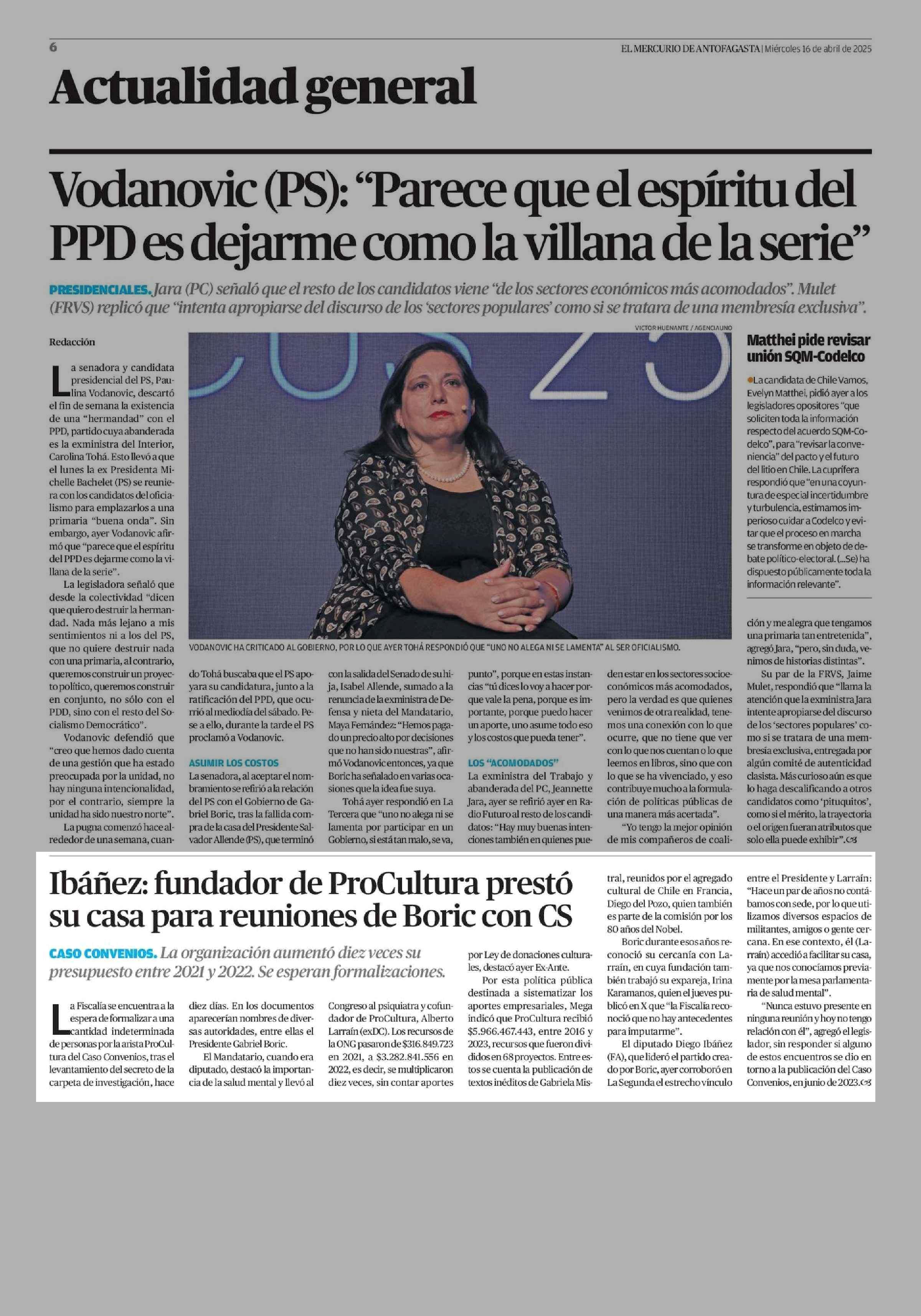 Ibáñez: fundador de ProCultura prestó su casa para reuniones de Boric con CS 16-04-2025 El Mercurio de Antofagasta |