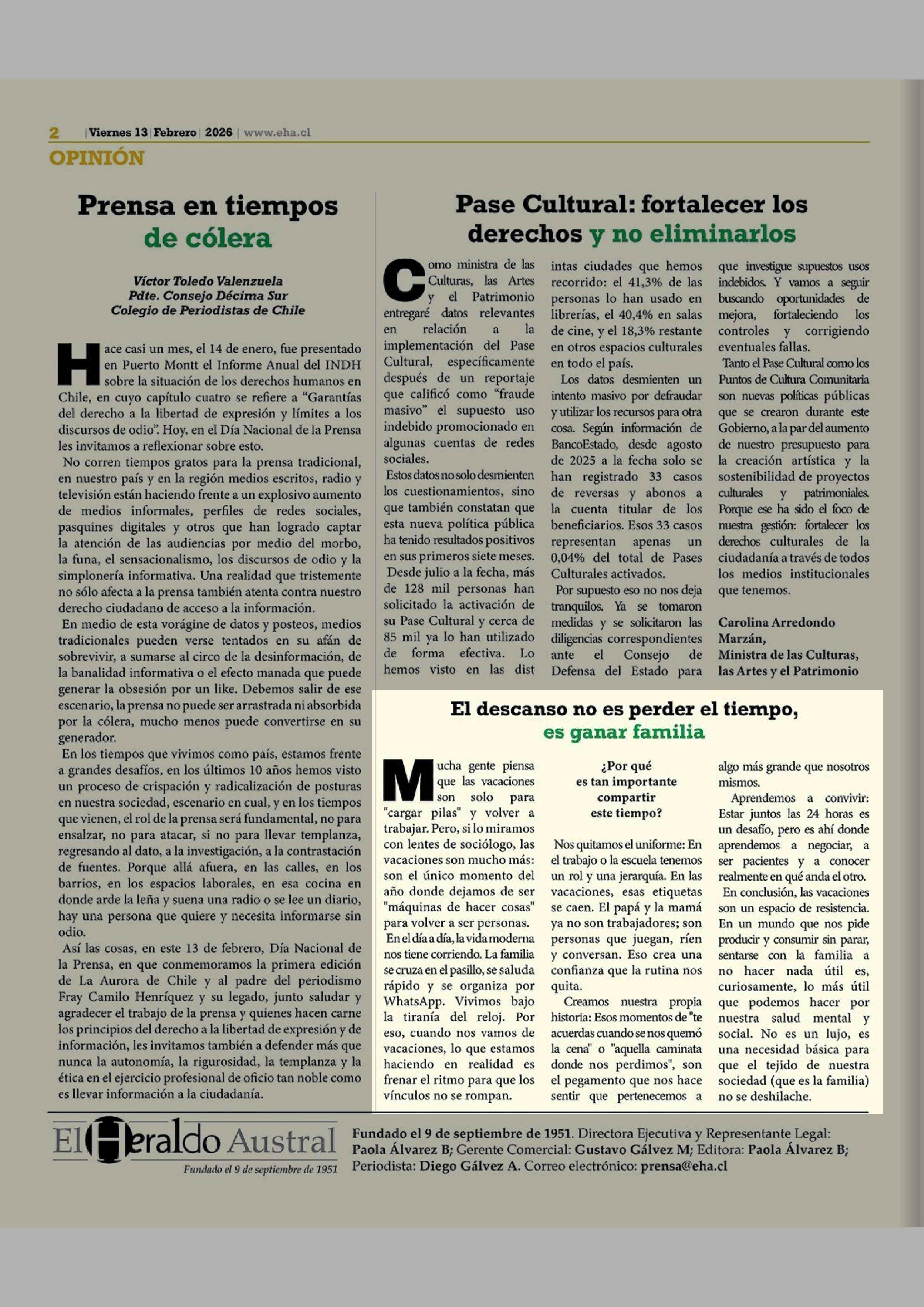 Fecha: 13-02-2026 Sector: Columnas de Opinión Región: Región de Los Lagos