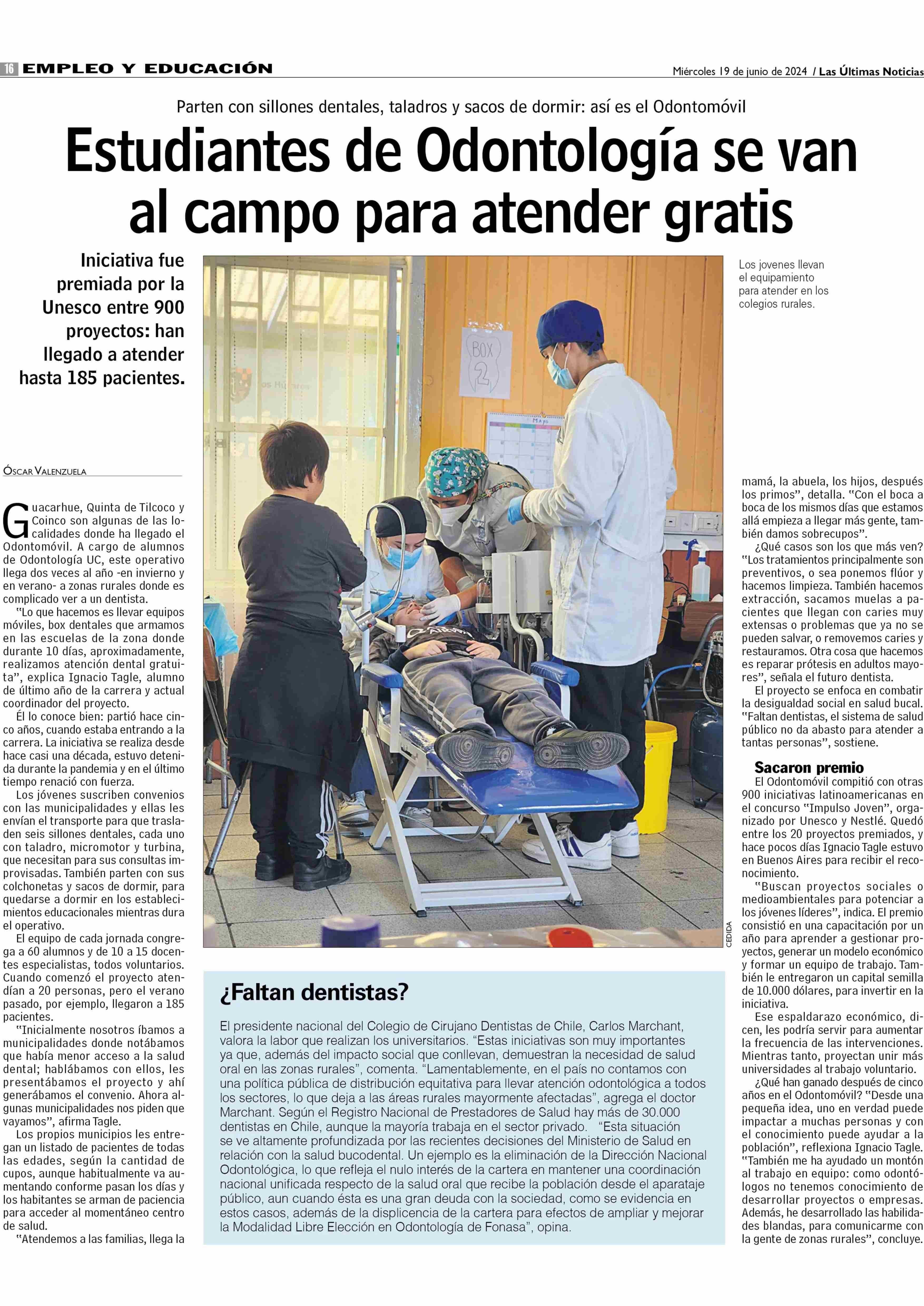 Estudiantes de Odontología se van al campo para atender gratis 19-06-2024 Las Últimas Noticias |