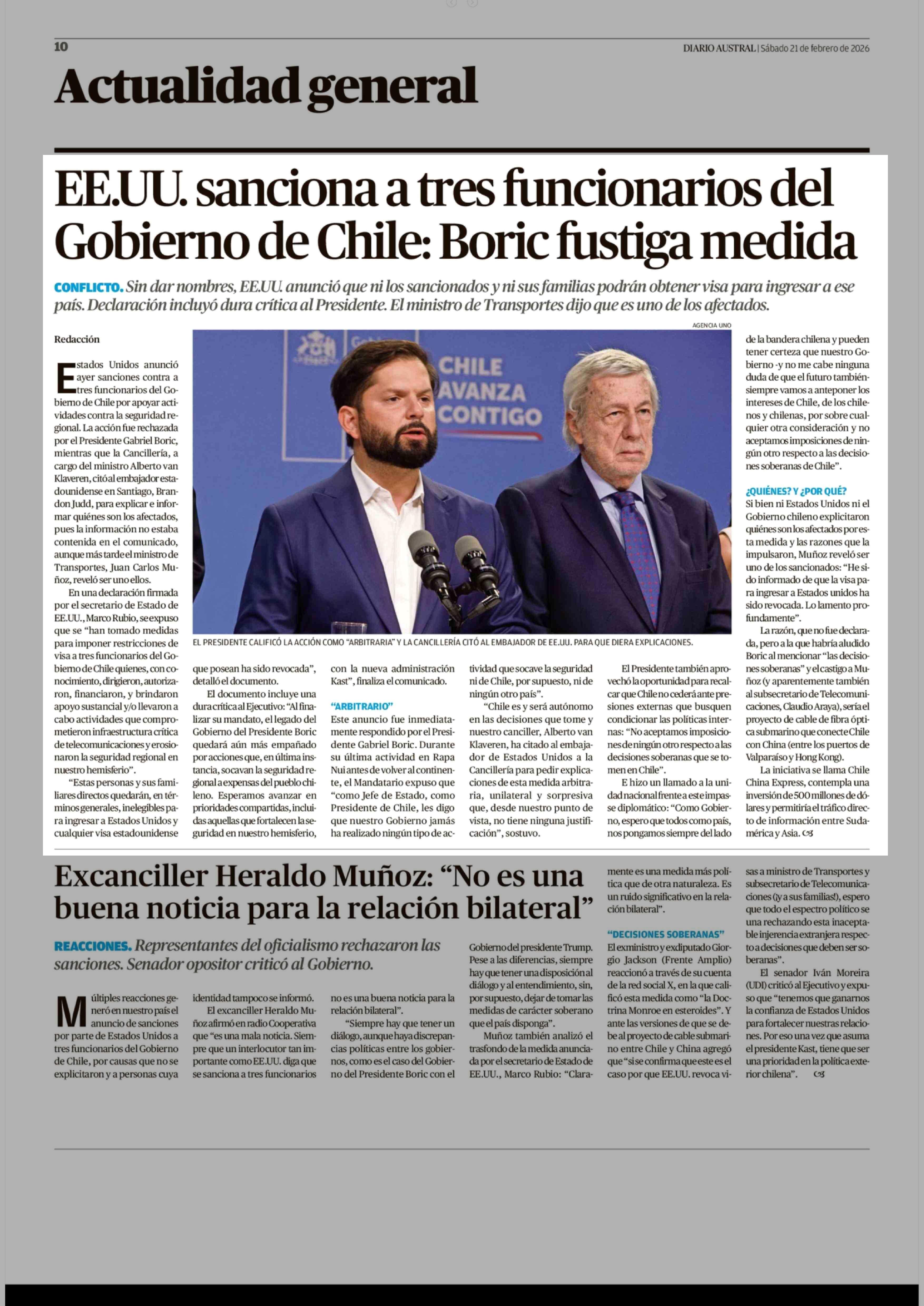Título: EE.UU. sanciona a tres funcionarios del Gobierno de Chile: Boric fustiga medida