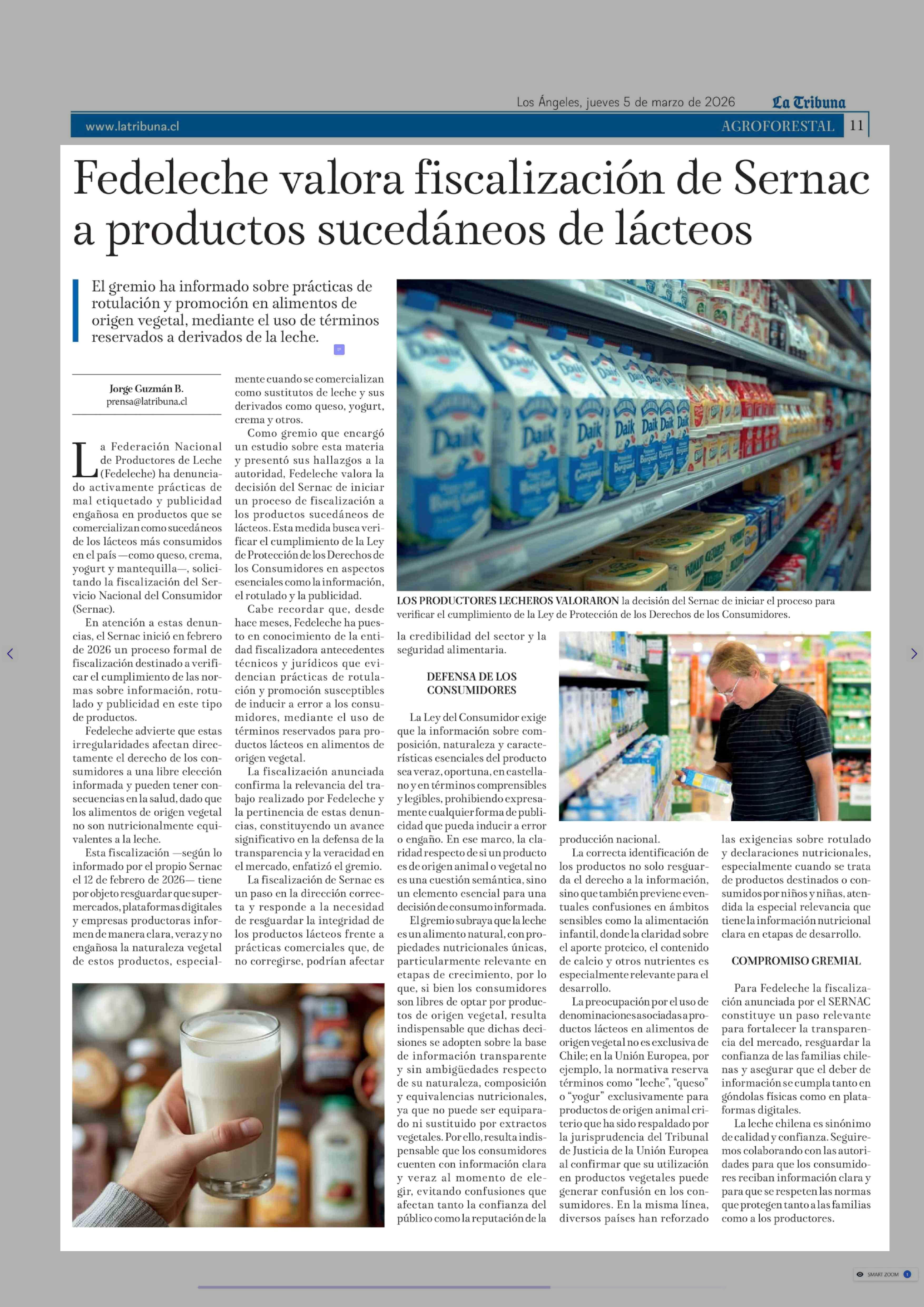 Fedeleche valora fiscalización de Sernac a productos sucedáneos de lácteos 05-03-2026 La Tribuna |