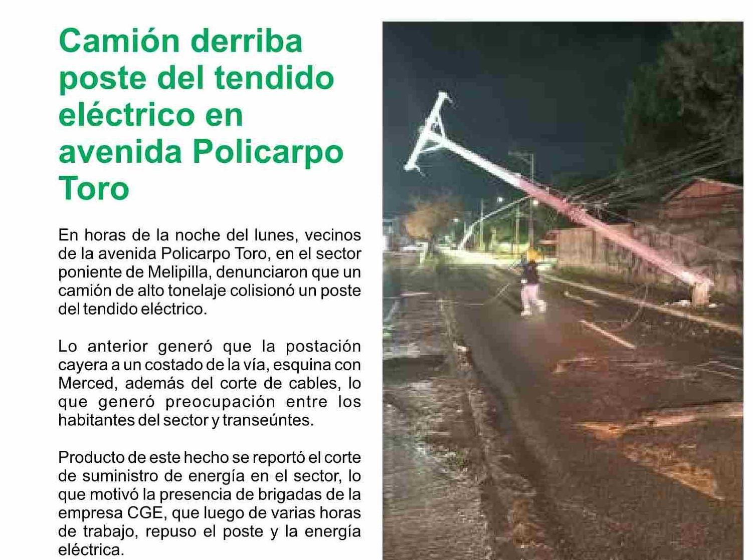 | Título: | Camión derriba poste del tendido eléctrico en avenida Policarpo Toro |