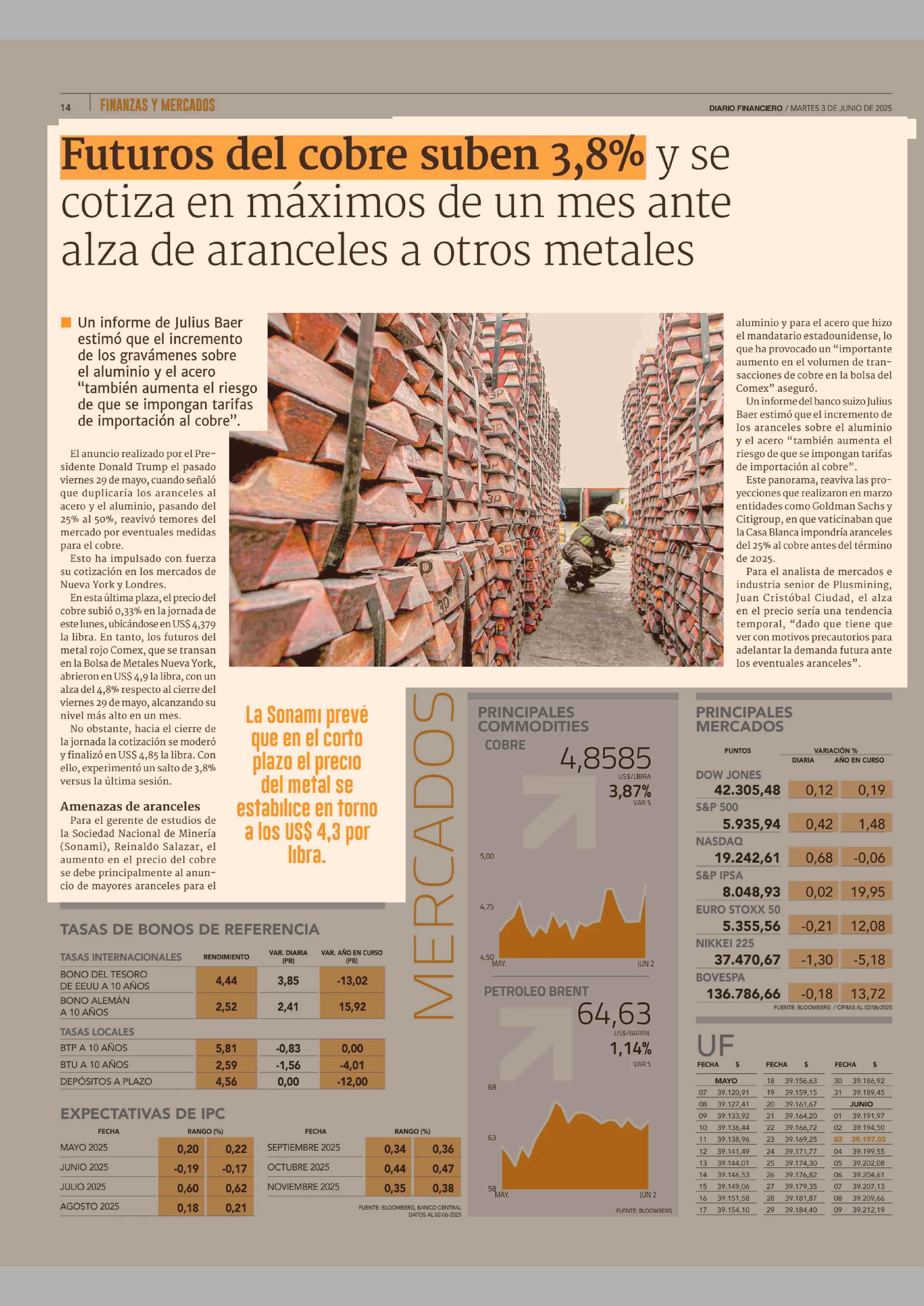 Futuros del cobre suben 3, 8% y se cotiza en máximos de un mes ante alza de aranceles a otros metales 03-06-2025 Diario Financiero |
