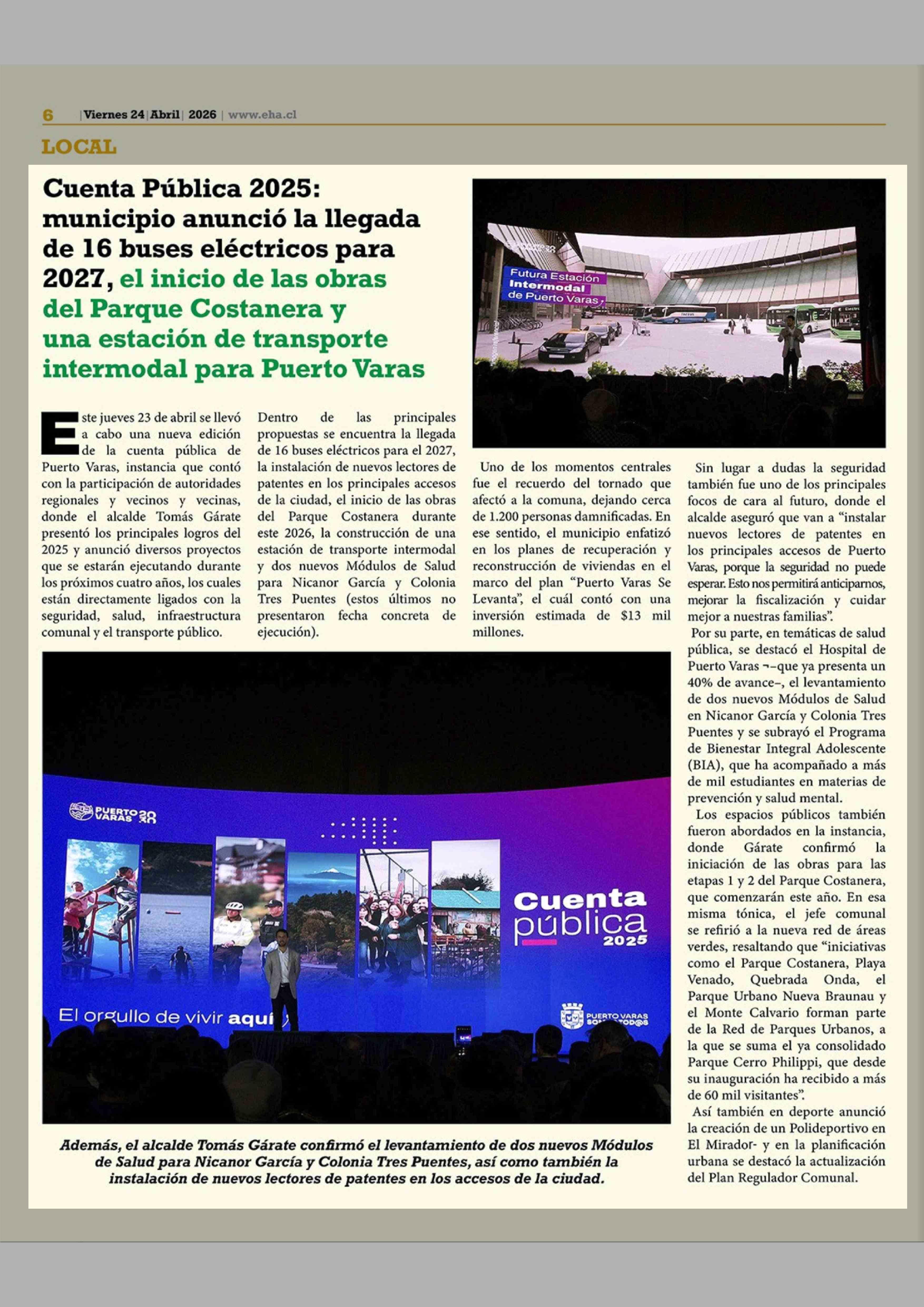 | Título: | Municipio anunció la llegada Cuenta Pública 2025: de 16 buses eléctricos para 2027, el inicio de las obras del Parque Costanera y una estación de transporte intermodal para Puerto Varas |