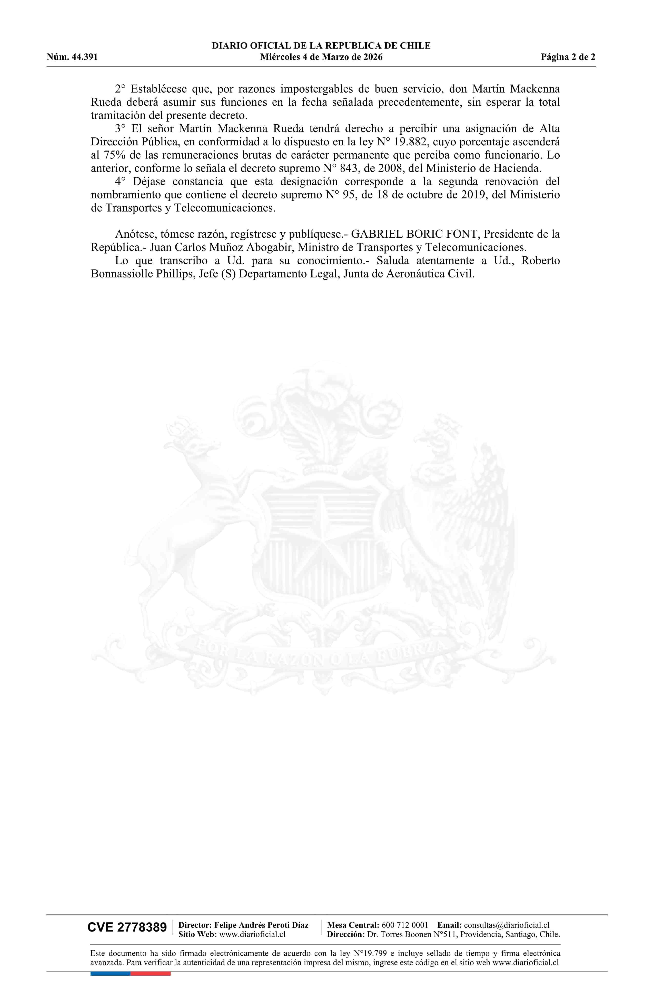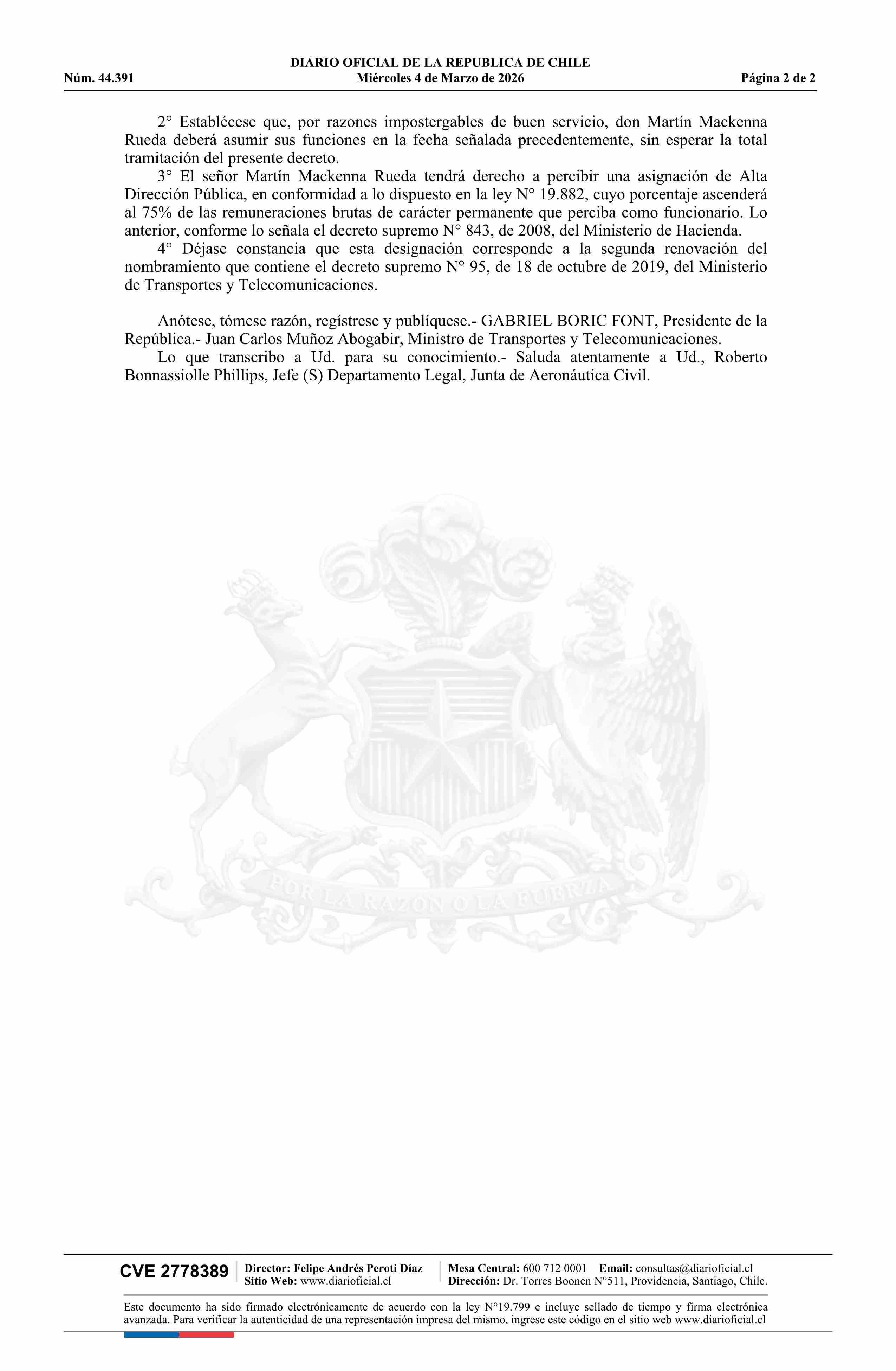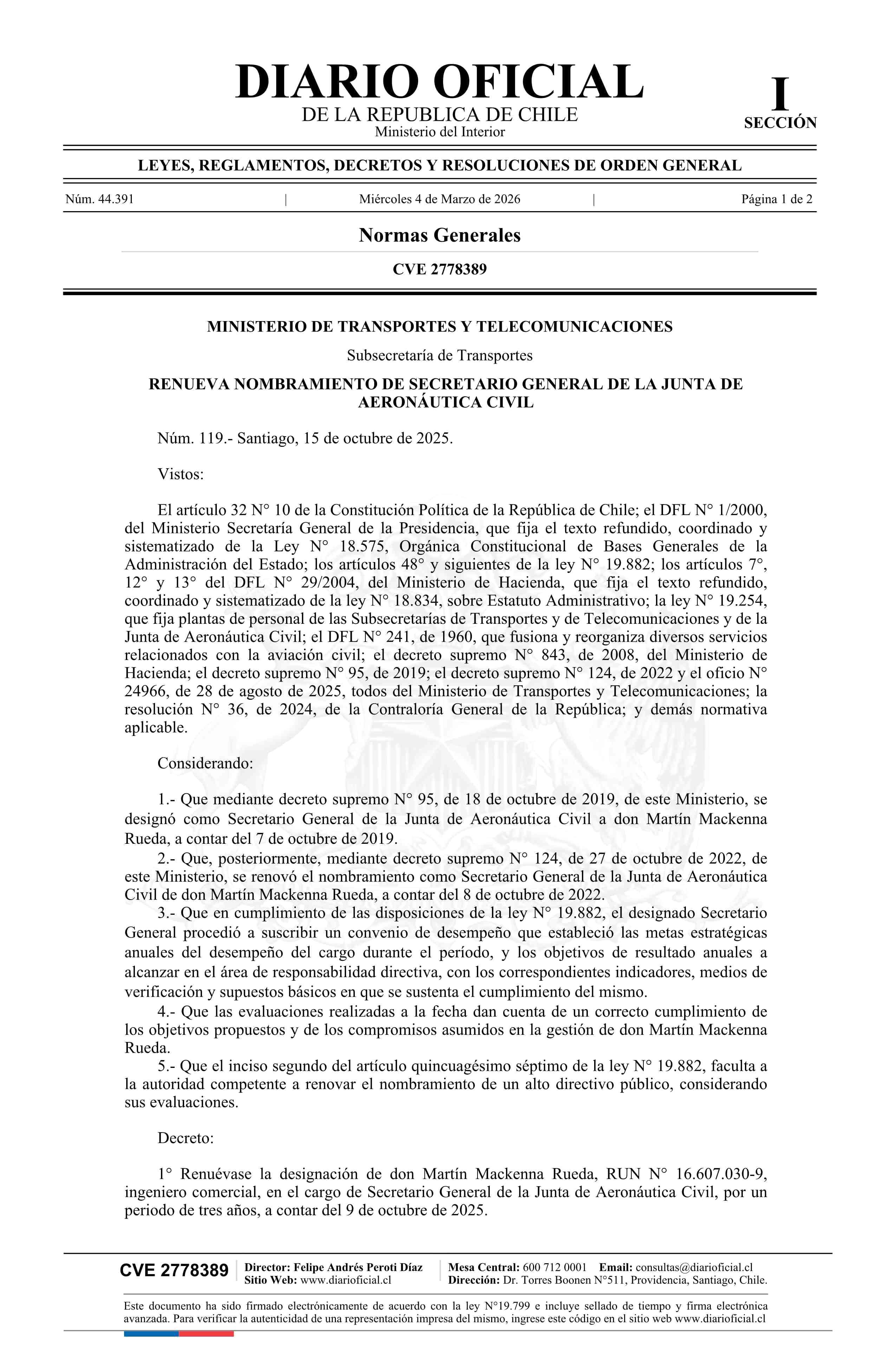 Decreto número 119, de 2025.- Renueva nombramiento de don Martín Mackenna Rueda en el cargo de Secretario General de la Junta de Aeronáutica Civil 04-03-2026 Diario Oficial Edición Electrónica |