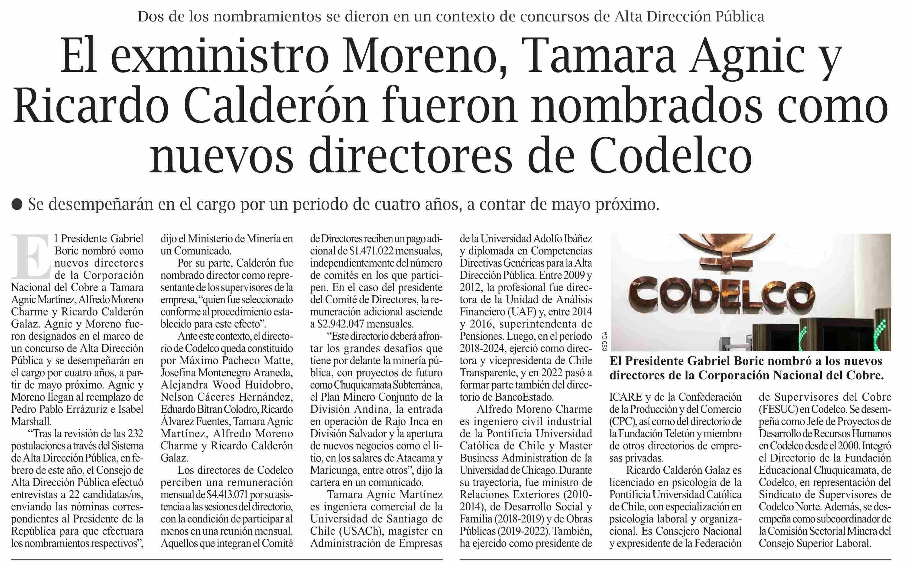| Título: | El exministro Moreno, Tamara Agnic y Ricardo Calderón fueron nombrados como nuevos directores de Codelco |