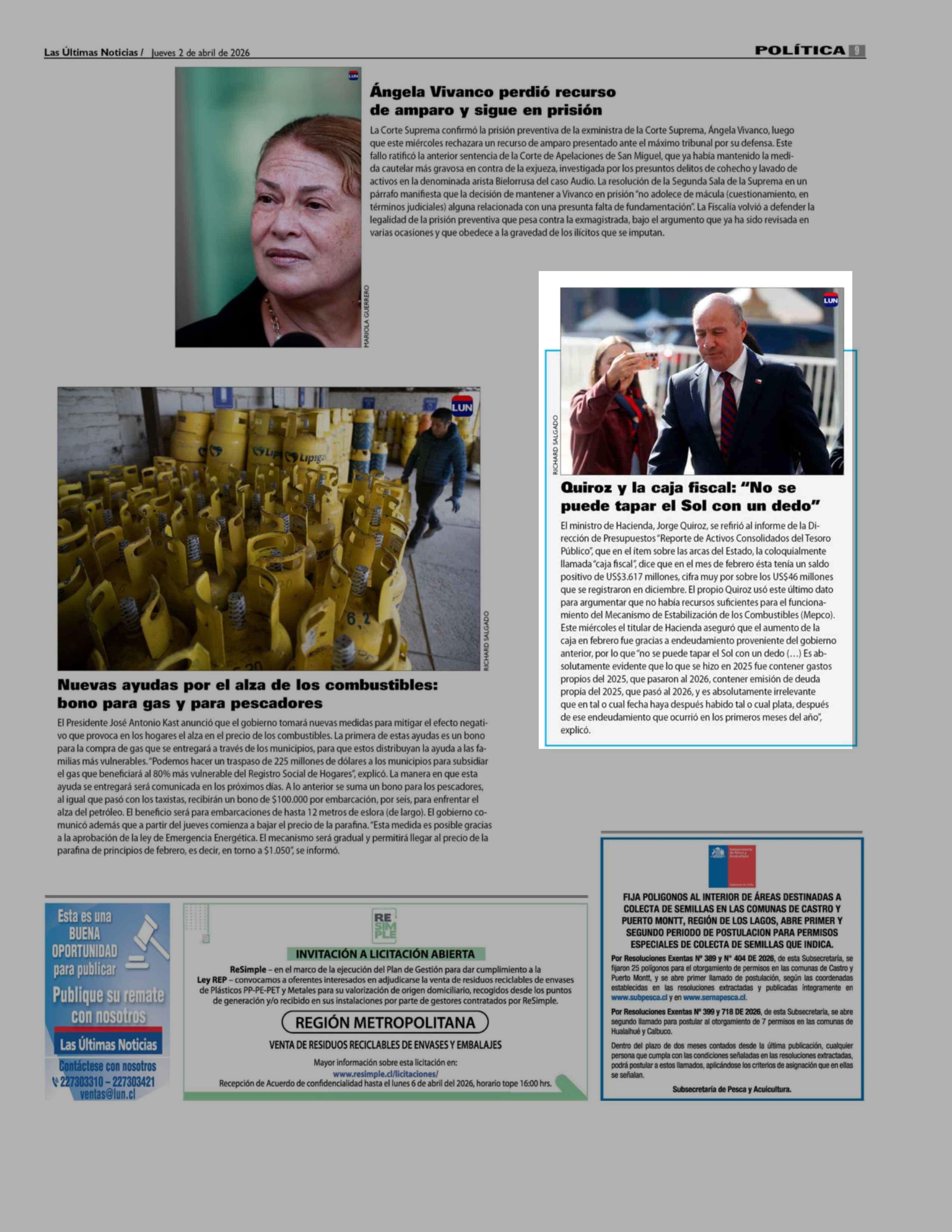 Quiroz y la caja fiscal: "No se puede tapar el Sol con un dedo" 02-04-2026 Las Últimas Noticias |