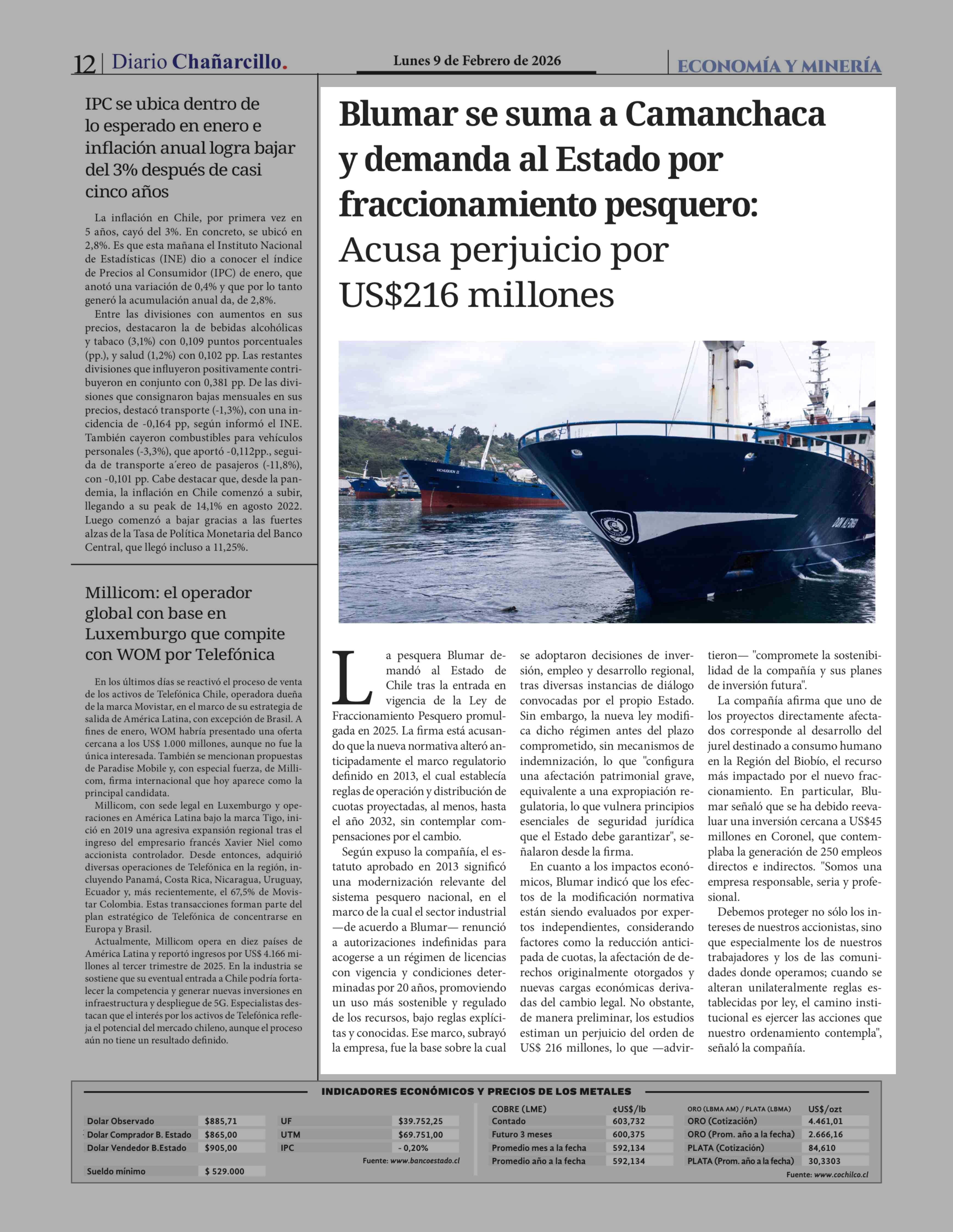 Título: Blumar se suma a Camanchaca y demanda al Estado por fraccionamiento pesquero: Acusa perjuicio por US$216 millones