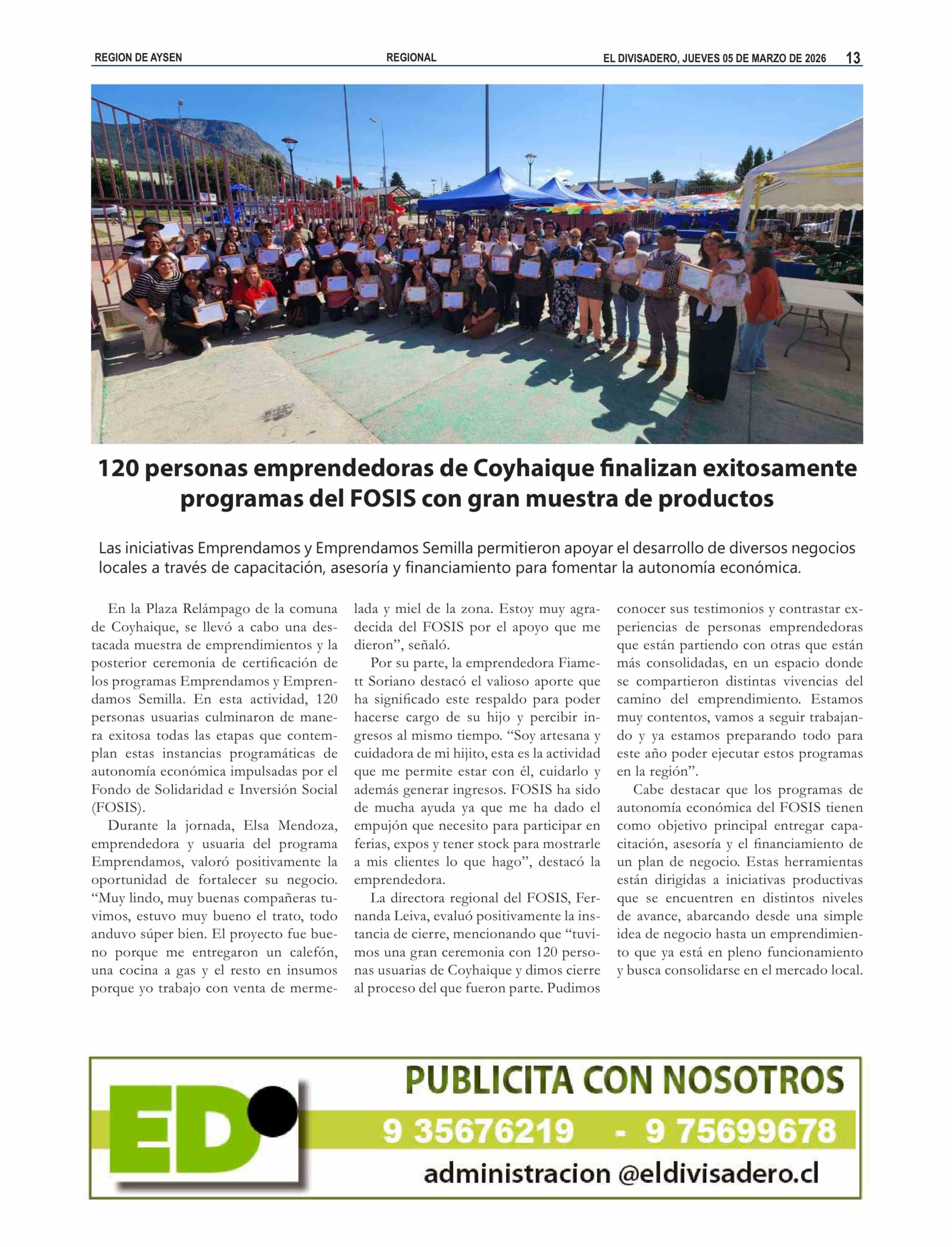Título: 120 Personas emprendedoras de Coyhaique finalizan exitosamente programas del FOSIS con gran muestra de productos