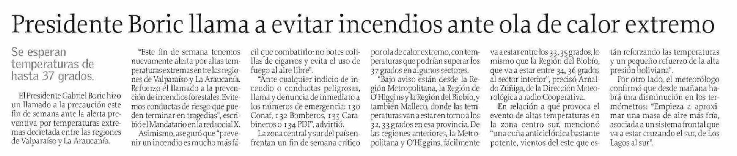 | Título: | Presidente Boric llama a evitar incendios ante ola de calor extremo |