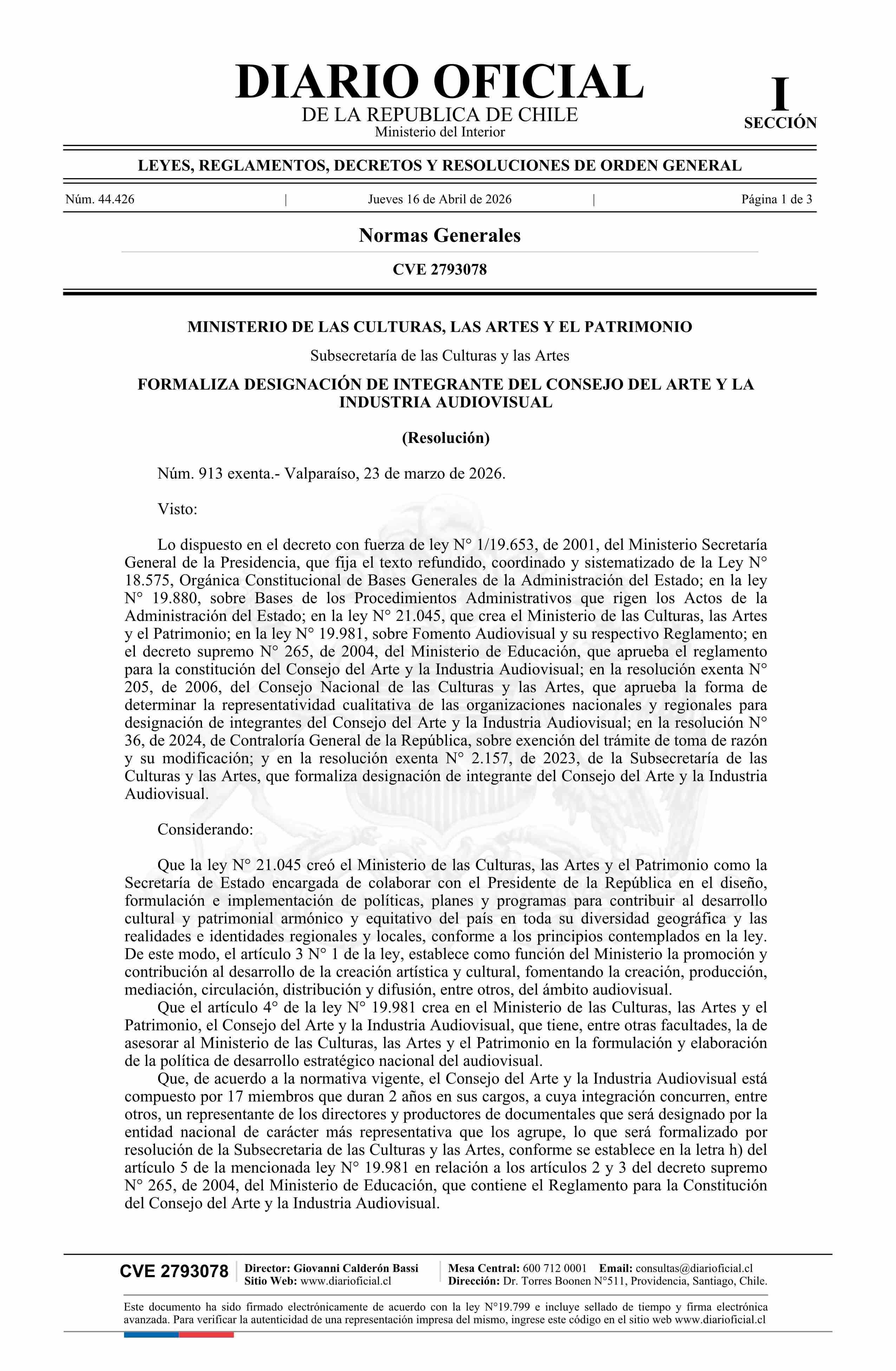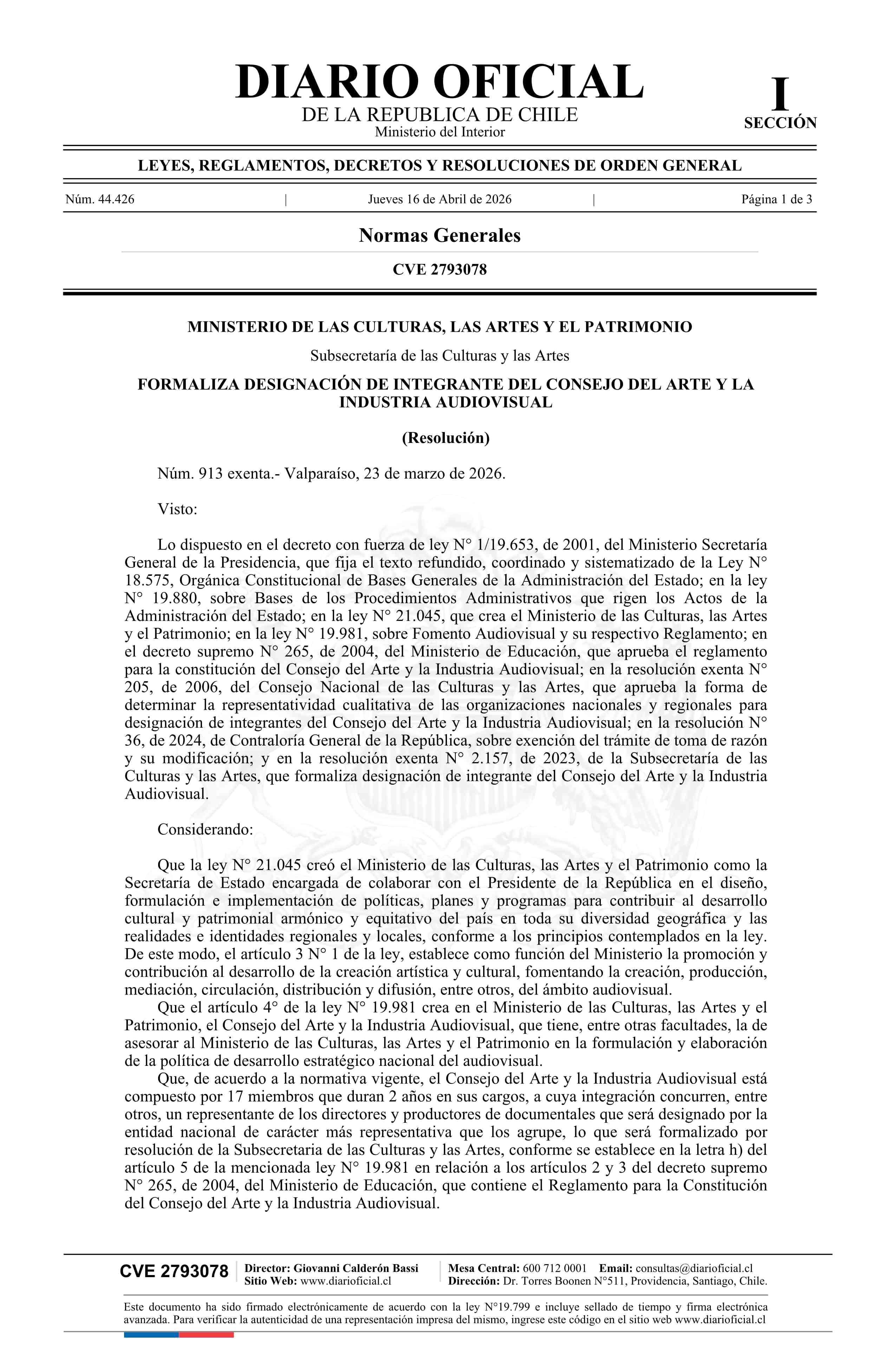 Título: Resolución exenta número 913, de 2026.- Formaliza designación de doña Francisca Margarita Poblete Pérez como integrante del Consejo del Arte y la Industria Audiovisual